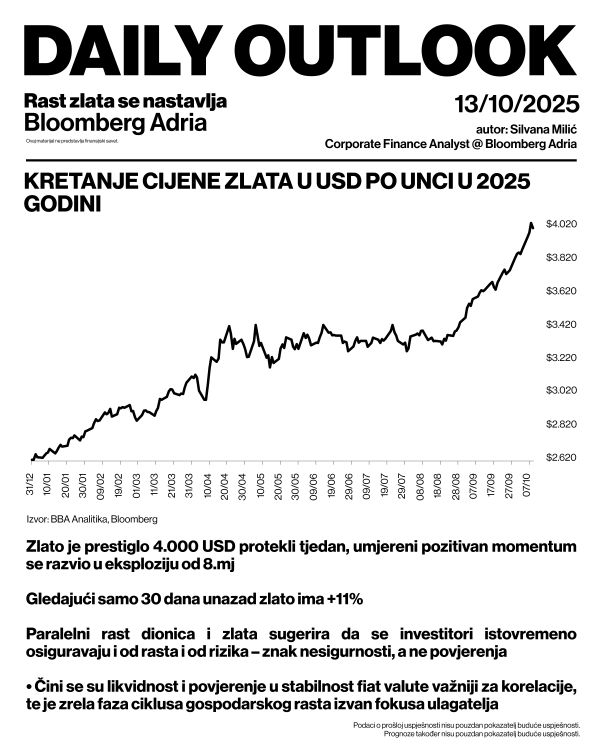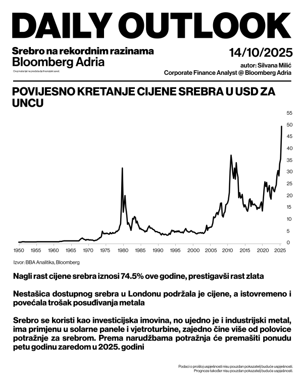 Cijena srebra dosegnula je povijesni maksimum od gotovo 53 dolara po unci zbog snažnog rasta potražnje za sigurnim ulaganjima i nestašice na londonskom tržištu. Zlato je također nastavilo višemjesečni rast, potaknuto kupnjama središnjih banaka, ETF ulaganjima i smanjenjem kamatnih stopa Fed-a.