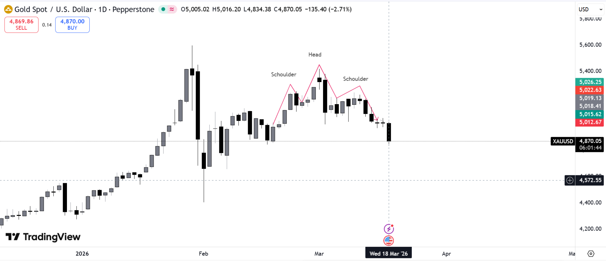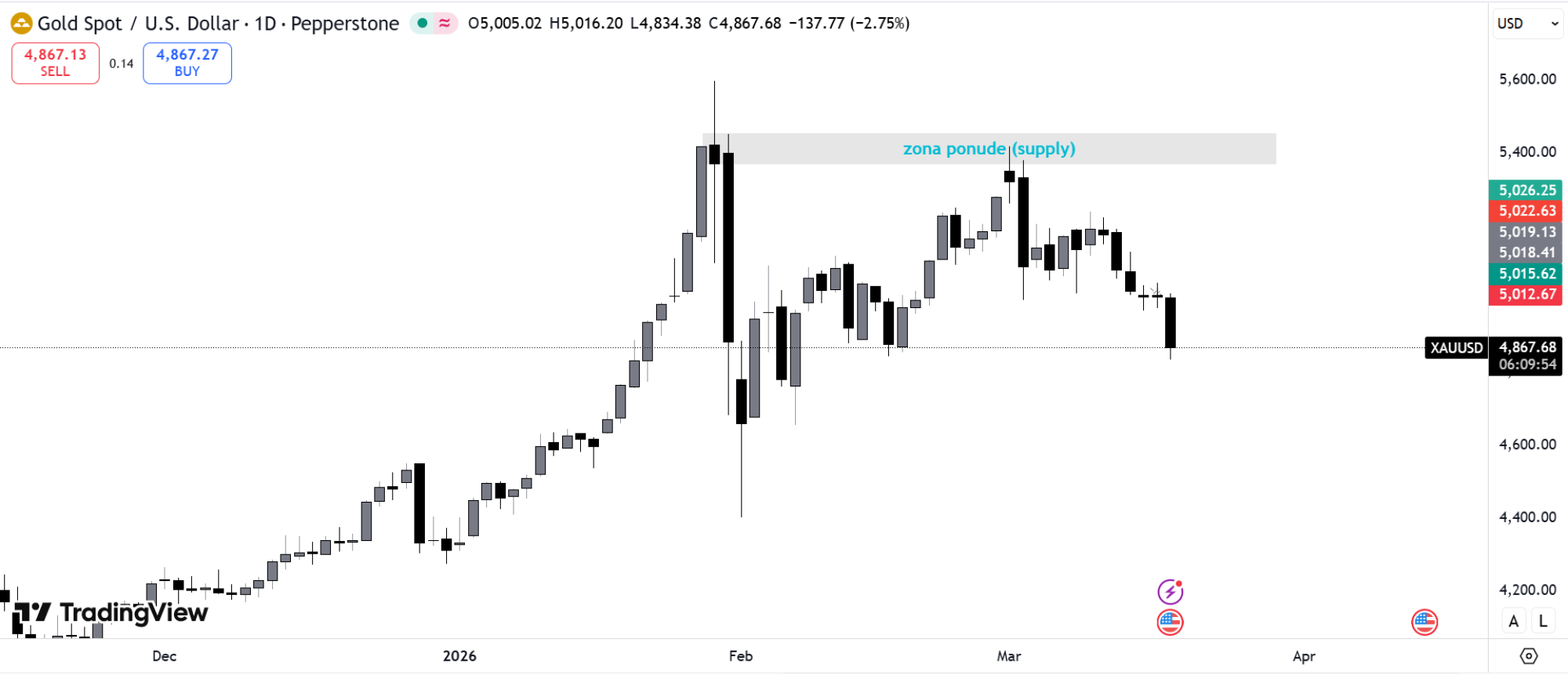 Upravo je iz tog područja cijena ponovno počela padati, unatoč snažnoj fundamentalnoj naraciji vezanoj uz eskalaciju sukoba u Iranu, koja bi inače podržavala uspon zlata kao sigurnog utočišta. Ovo kretanje pokazuje da tržište reagira ne samo na vijesti, već prije svega na likvidnost i razine na kojima se aktiviraju veliki nalozi.