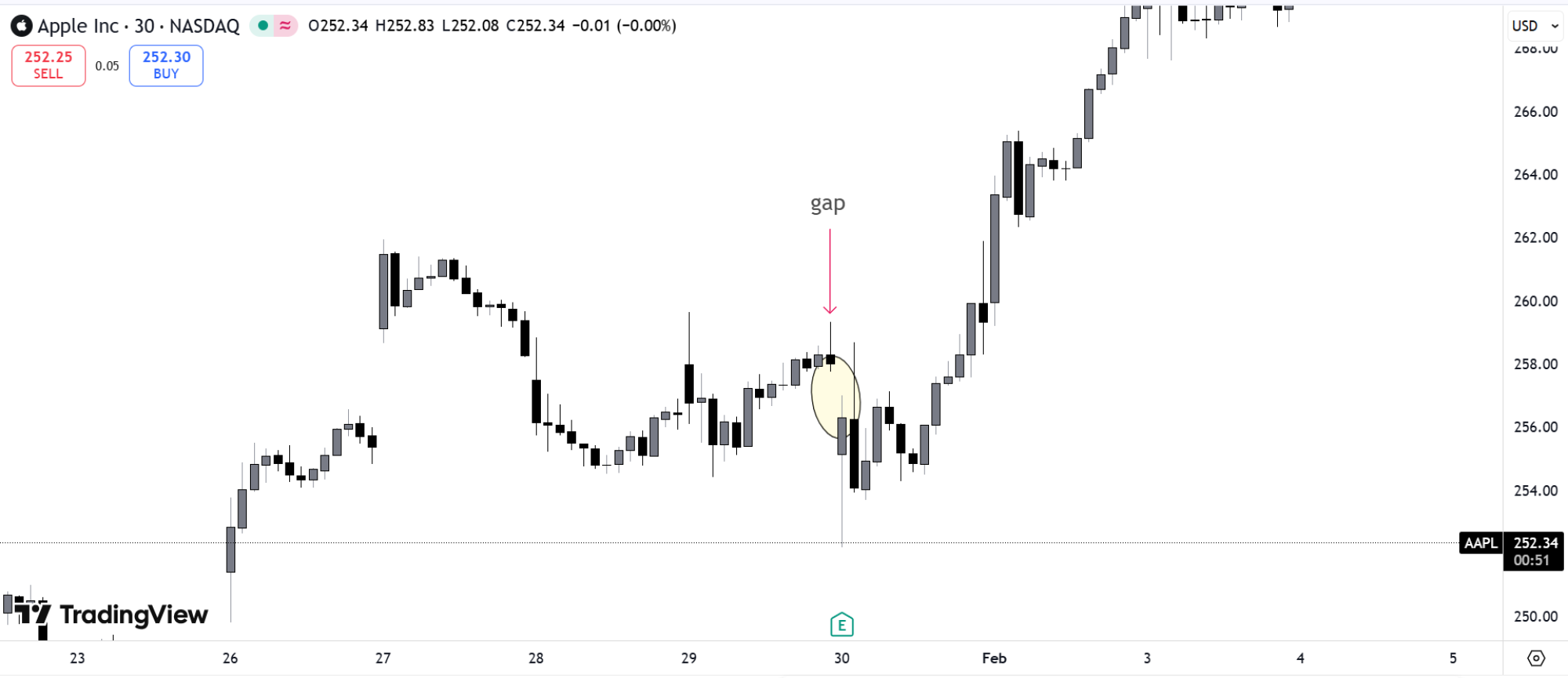 Sličan princip može se vidjeti u takozvanom "gapu" (rupi u cijeni) kretanja dionice Applea nakon objave kvartalnih rezultata. Nakon naglog skoka ili pada, tržište vrlo često pokušava "zatvoriti jaz" prije nego što krene dalje, što je obrazac koji mnogi sudionici slijede i koriste.