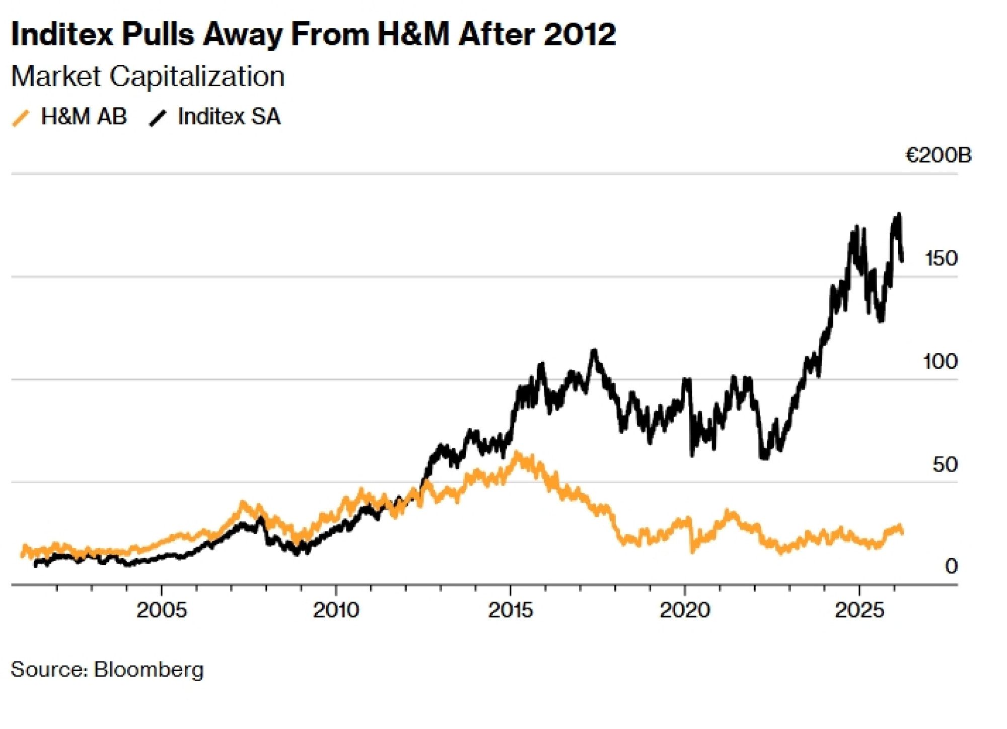 Prije desetljeća, na H&M i Inditex gledalo se kao na jednake partnere. Dvije su tvrtke početkom 2010-ih ostvarivale široko usporedivu dobit. Međutim, po tržišnoj vrijednosti, Inditex se počeo odvajati nakon otprilike 2012. godine.