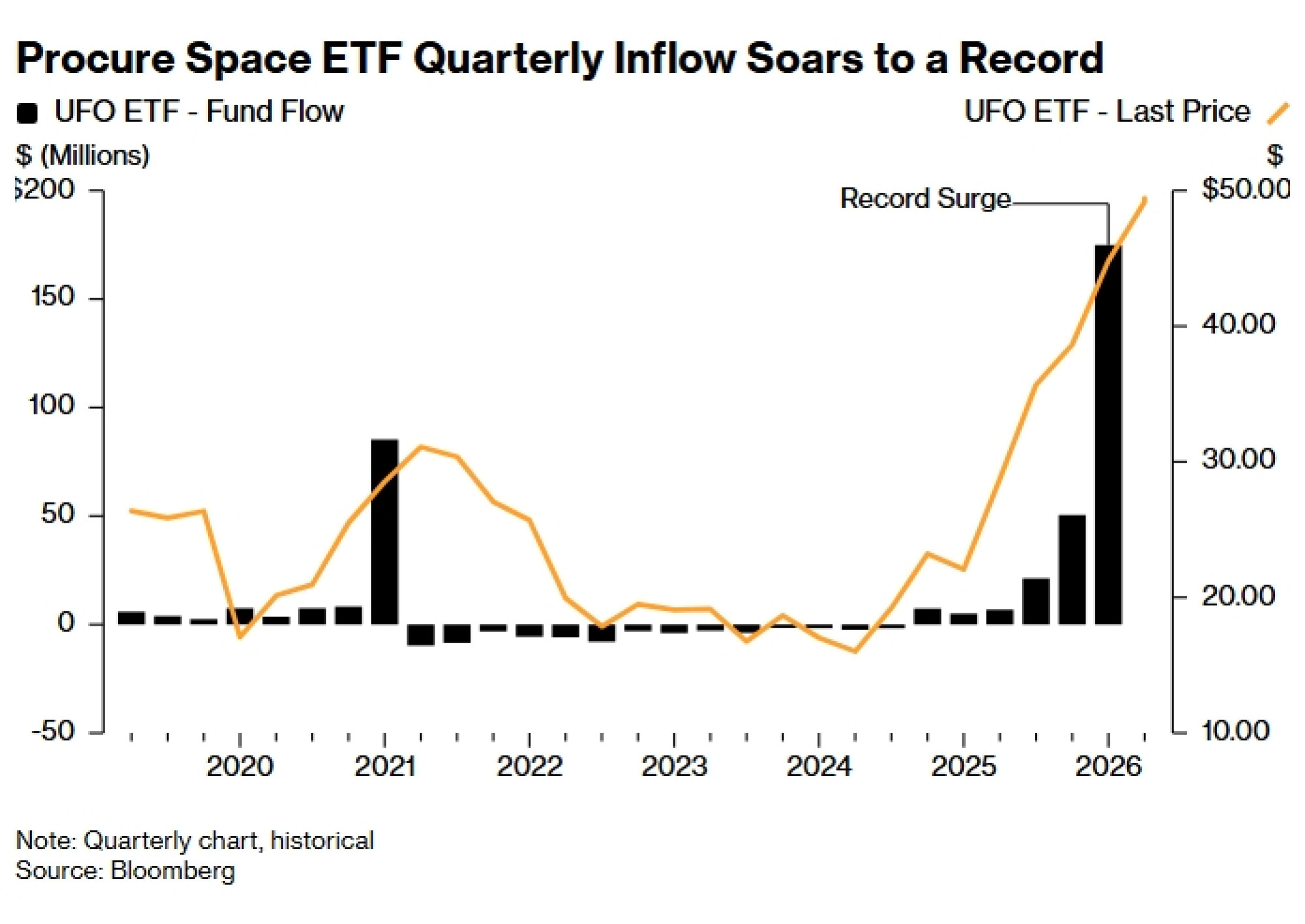 Procure Space ETF (ticker: UFO), fond s tržišnom vrijednošću od oko 415 milijuna dolara, privukao je gotovo 175 milijuna dolara u prvom kvartalu godine, što su najveći priljevi od njegova osnutka 2019. godine, prema podacima koje je prikupio Bloomberg.