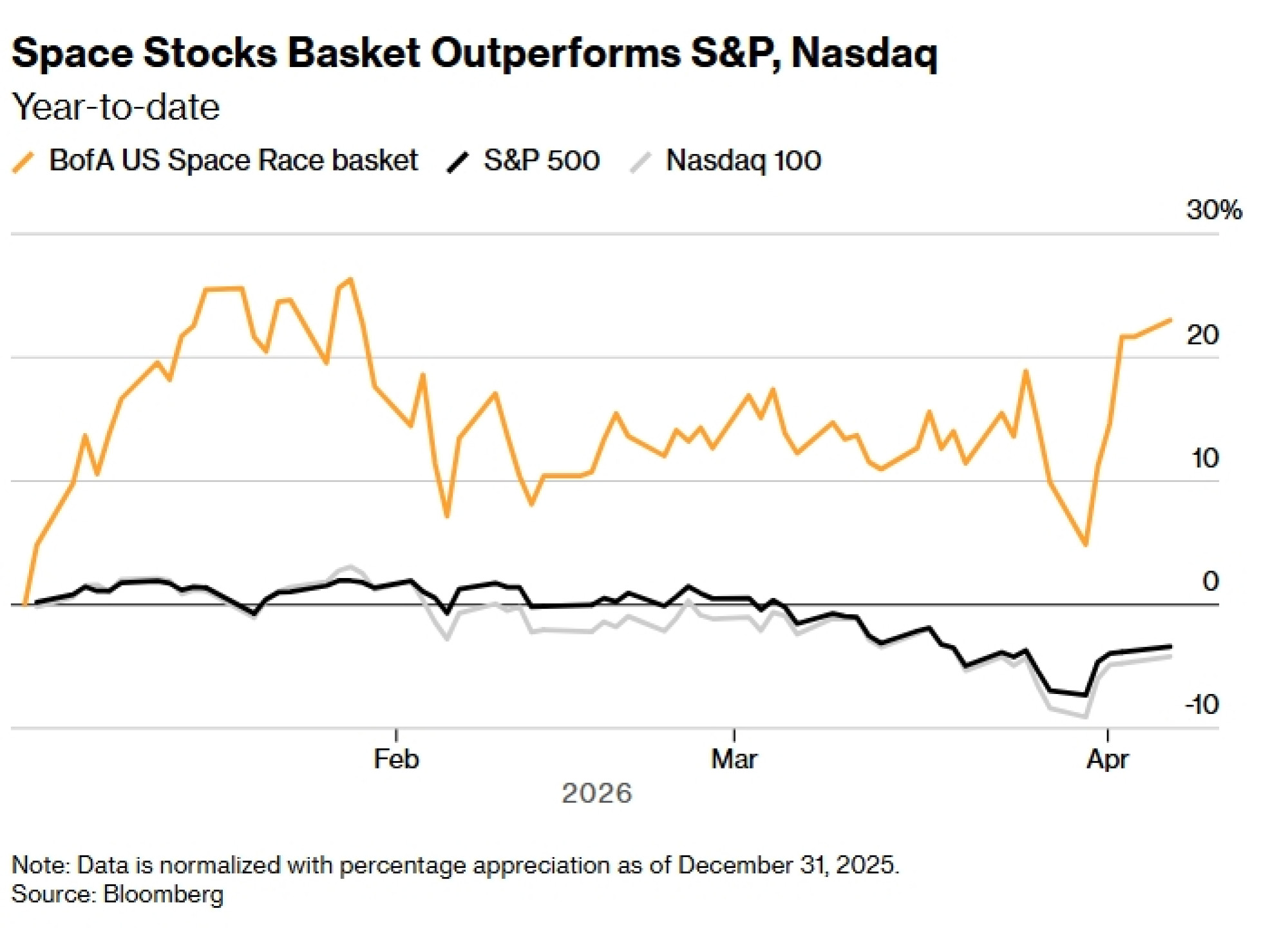 Bank of America Corp. košarica američkih dionica koje su ključni igrači i potencijalni dobitnici svemirske utrke porasla je za 23 posto ove godine, u usporedbi s padom od 3,4 posto indeksa S&P 500 i padom od 4,2 posto indeksa Nasdaq 100.