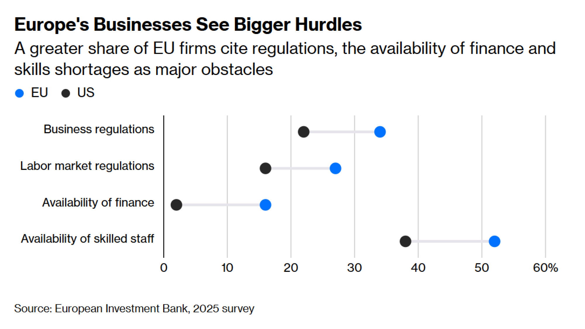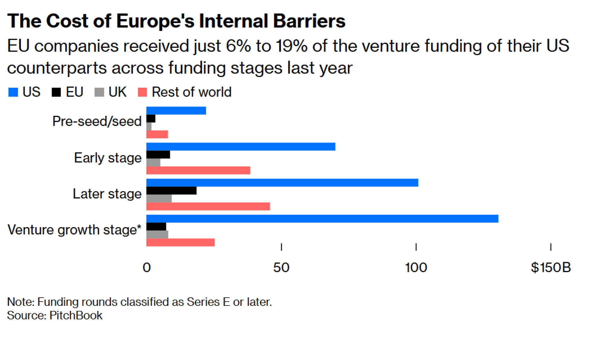 Iako kontinent stvara otprilike jednak broj startupova u ranoj fazi kao i SAD, daleko ih manje izraste u velike, prekogranične tvrtke. Američke tvrtke primaju gotovo pet puta više rizičnog kapitala (venture funding) od svojih ekvivalenata u EU-u – ili 1,2 bilijuna dolara više od 2020. godine kroz cijeli ciklus financiranja, pri čemu je najveći jaz u kasnijim fazama.