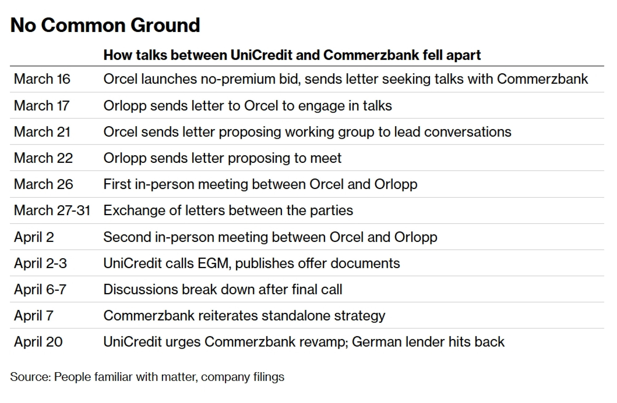 Ako je i postojao osjećaj da obje strane mogu pronaći zajednički jezik, on je brzo ispario. U ponedjeljak ujutro, Orcel je oštro kritizirao Commerzbank kao "priču o lošim operativnim rezultatima" koja će vjerojatno morati proći kroz još jedno bolno restrukturiranje bez postignutog dogovora. Orlopp, koja je neuspjeh pregovora proglasila već ranije u travnju, uzvratila je navečer; Commerzbank je izdao priopćenje u kojem je Orcelov prijedlog restrukturiranja nazvao "spekulativnim pokušajem demontiranja" njihovog "uspješnog poslovnog modela".