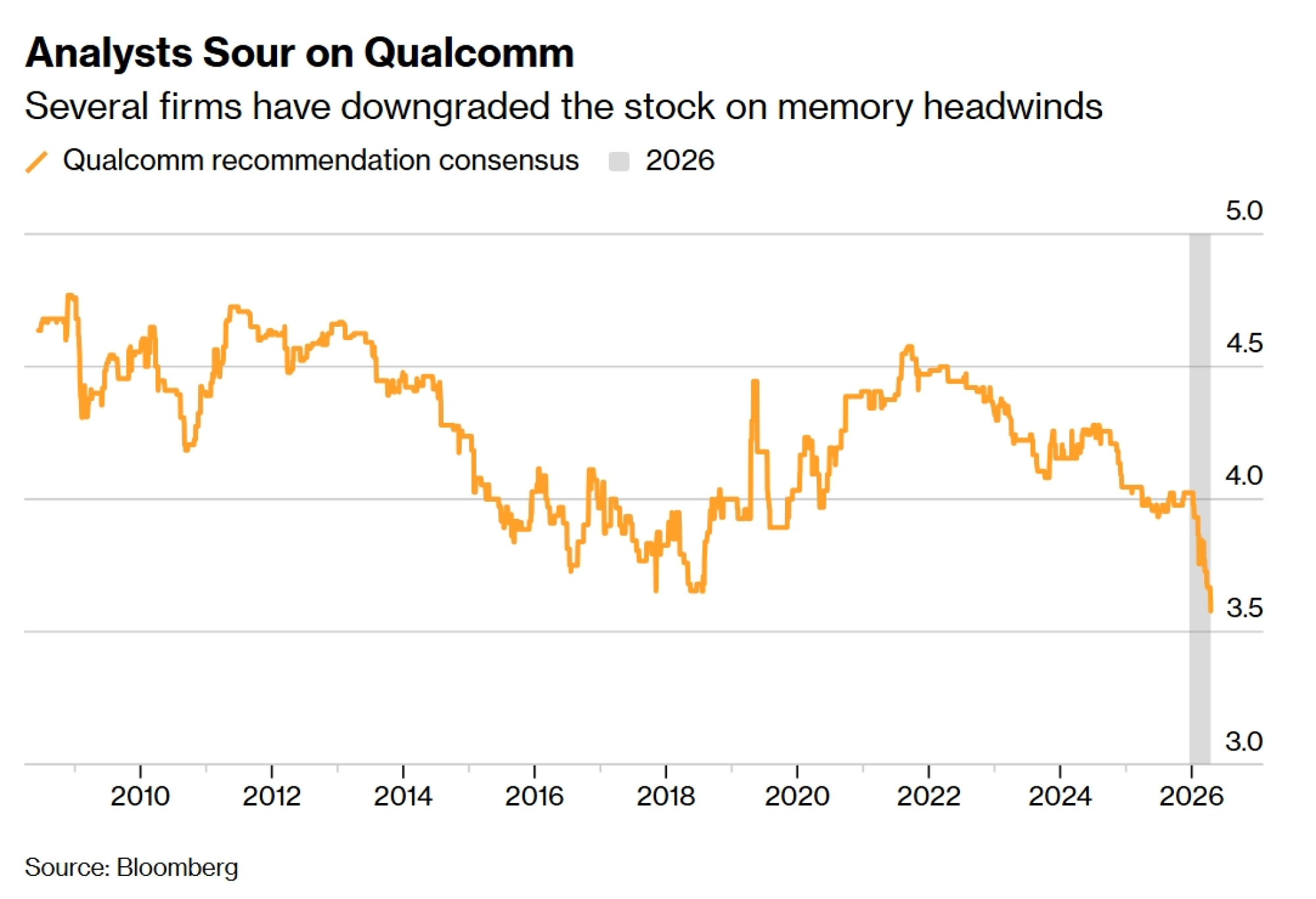 Dionica je ove godine dobila barem osam sniženja rejtinga. Od 45 analitičara koji prate Qualcomm, njih 17 ima preporuku za kupnju, a troje za prodaju, što je najlošiji konsenzus preporuka od barem 2008. godine. Za usporedbu, proizvođači čipova u sektoru umjetne inteligencije poput kompanija Nvidia Corp., Broadcom Inc. i Micron Technology Inc. imaju preporuke za kupnju od više od 90 posto analitičara koji ih prate.