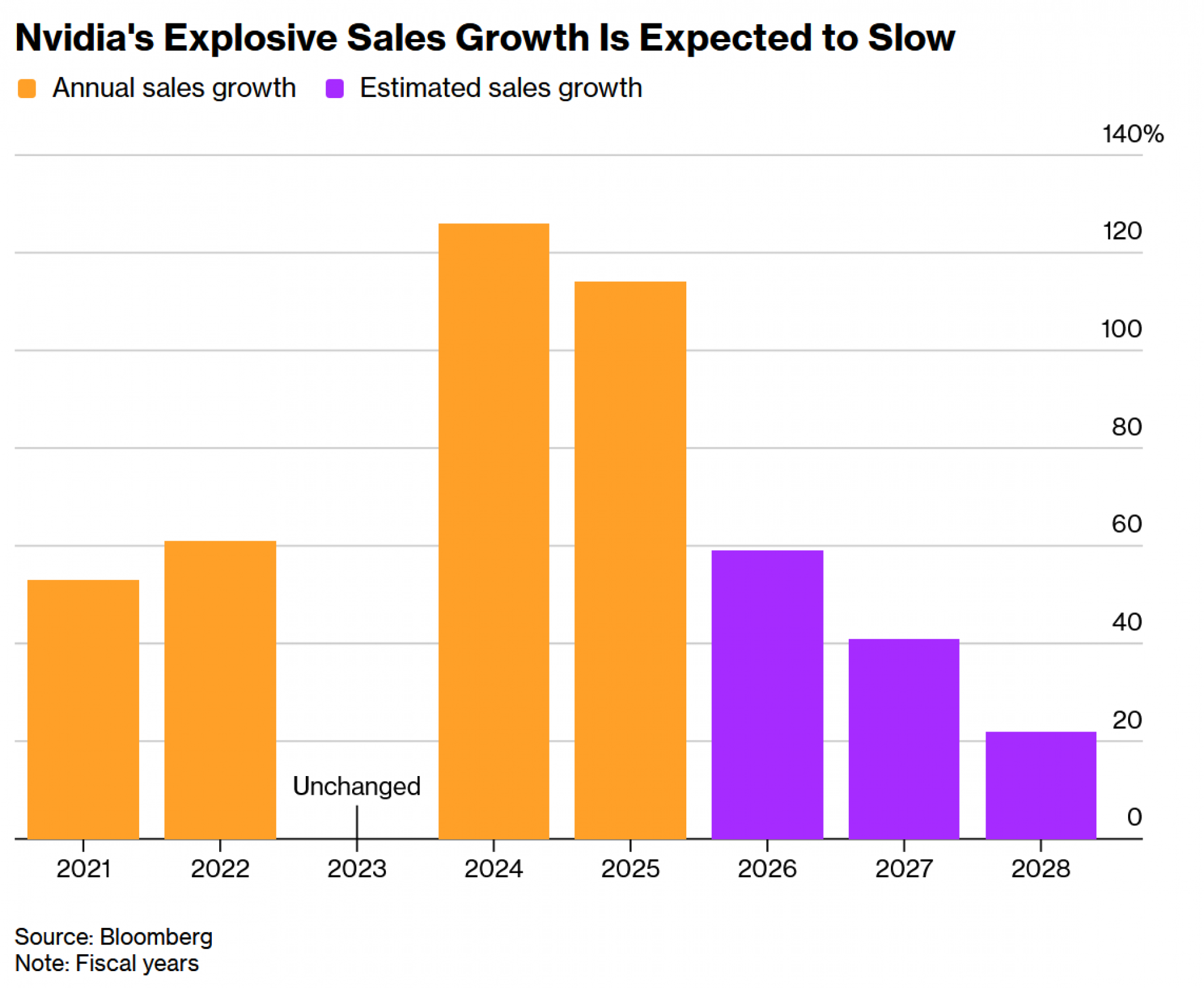 Analitičari predviđaju usporavanje Nvidijine rastuće prodaje u nadolazećim godinama. Očekuje se da će tvrtka ostvariti povećanje prihoda od gotovo 60 posto u fiskalnoj godini 2026., koja završava u siječnju, nakon čega slijedi 41 posto u fiskalnoj godini 2027. i 22 posto u fiskalnoj godini 2028. godini.