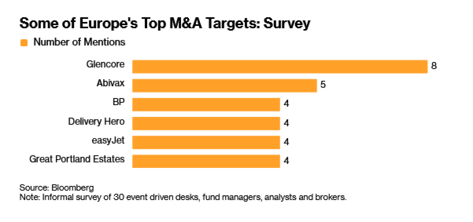Glencore, koji je u pregovorima s grupom Rio Tinto o stvaranju najveće svjetske rudarske tvrtke, osam je puta spomenut u neformalnoj anketi Bloomberga provedenoj ovog mjeseca među 30 timova za arbitražu rizika, trgovaca i analitičara. Tvrtke iz različitih sektora izdvojile su se u anketi, što odražava kako potencijalni kupci bacaju širu mrežu kako globalno gospodarstvo dobiva na zamahu.