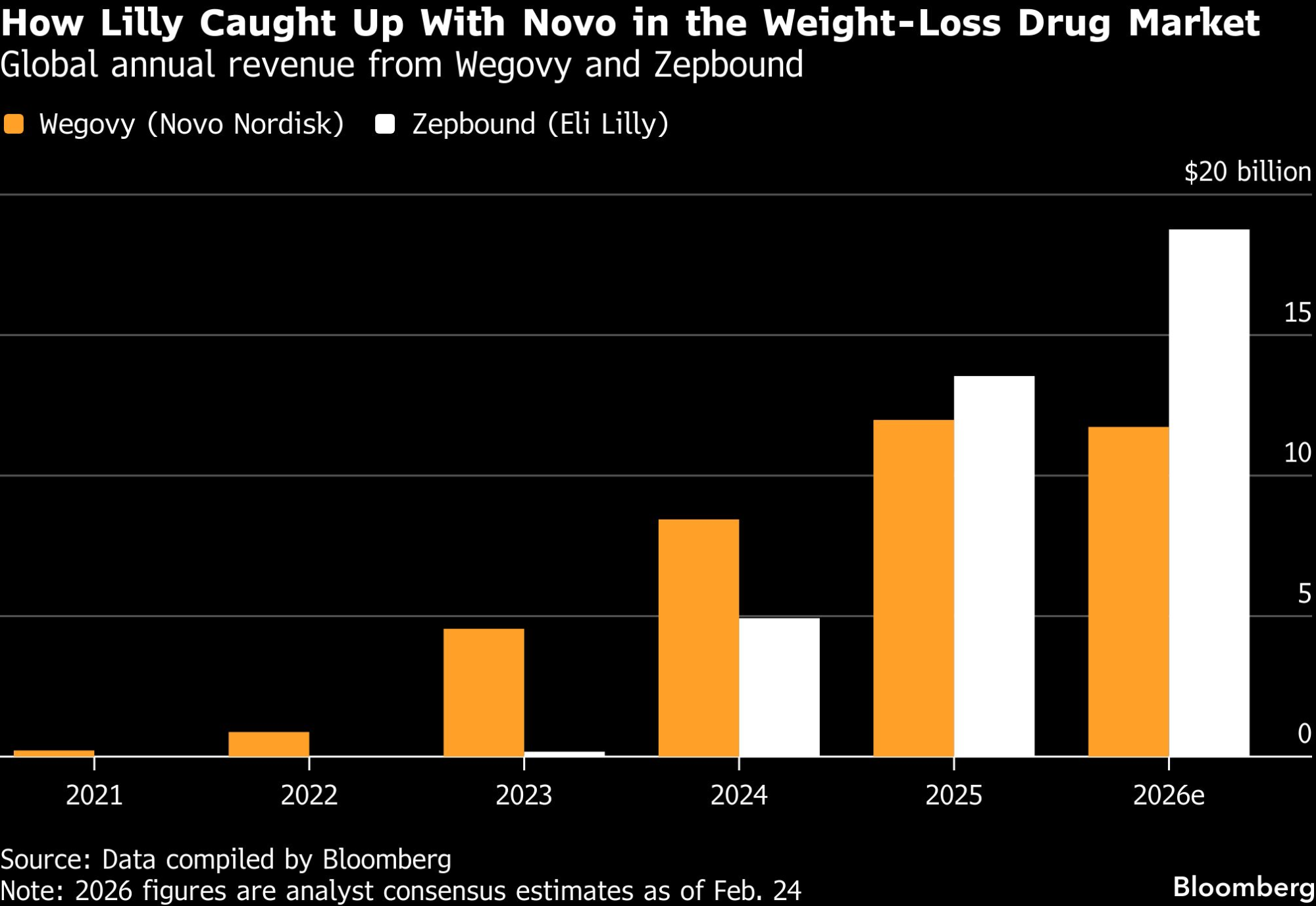 Međutim, iako je njihov lijek za pretilost Zepbound dospio na tržište tek 2023. godine, on je pokazao superiorne rezultate mršavljenja u odnosu na Wegovy u izravnom kliničkom ispitivanju. Prodaja Zepbounda premašila je Wegovy u dolarima prošle godine i očekuje se da će se ta prednost dodatno povećati u 2026. godini, prema konsenzusu analitičara koji je prikupio Bloomberg.
