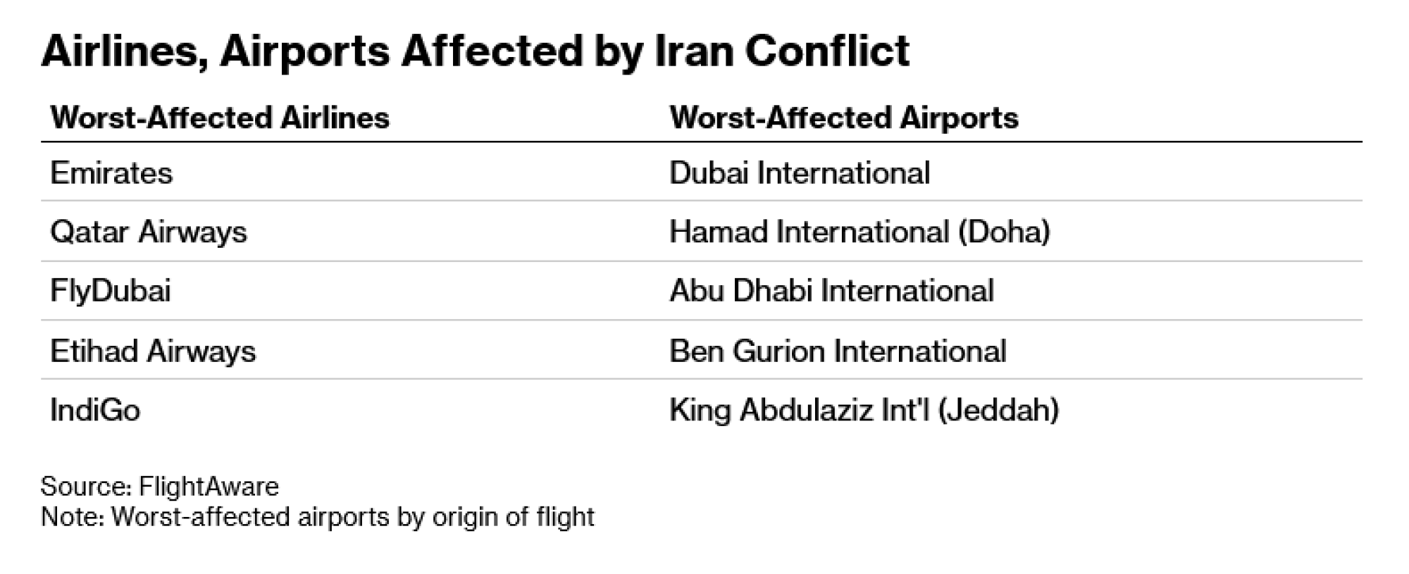 Indijska uprava za civilno zrakoplovstvo priopćila je da su lokalni prijevoznici u subotu otkazali 410 letova, a očekuje se da će njih 444 biti otkazano u nedjelju. Zrakoplovne tvrtke diljem svijeta, od Kanade i Europe do Singapura, obavijestile su da su obustavile svoje letove prema Bliskom istoku.