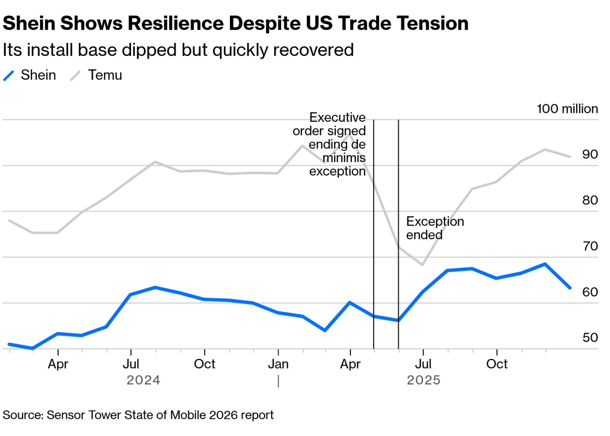 Prošle godine, na vrhuncu tenzija između SAD-a i Kine, Trump je ukinuo dugogodišnje izuzeće od carina na robu ispod 800 dolara koje je bilo ključno za uspjeh platformi Temu (u vlasništvu kompanije PDD Holdings Inc.) i Shein. Međutim, iako je broj aktivnih korisnika na obje platforme prvotno pao, na kraju su se ipak oporavile (sudeći prema podacima tvrtke Sensor Tower, Shein se pogotovo brzo vratio u formu).