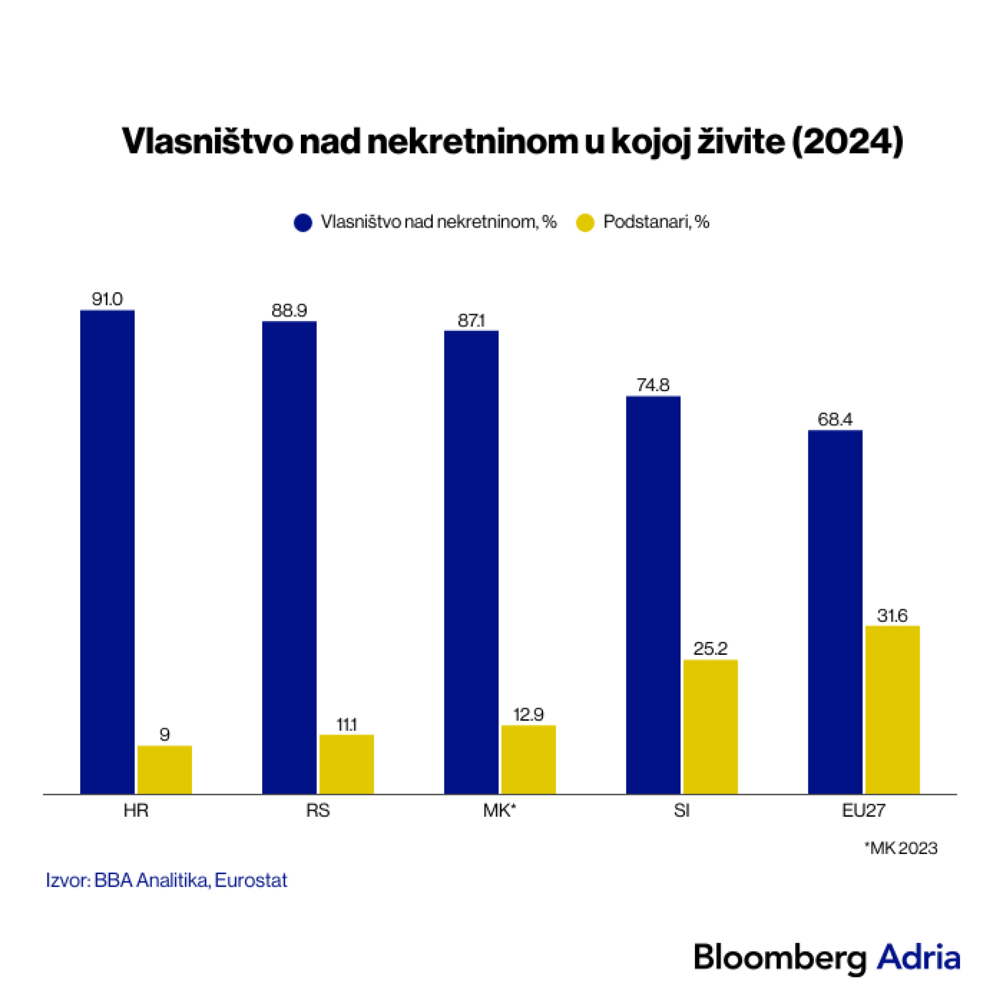 Po njemu je sreća u nesreći što građani u Adrija regiji imaju u vlasništvu nekretninu u kojoj žive. U prosjeku 80 posto stanovnika u regiji živi u svojoj nekretnini, dok ostatak unajmljuje prostor u kojem stanuje. U EU27 taj prosjek iznosi 68 posto, a u zapadnim zemljama taj prosjek pada i ispod 50 posto.