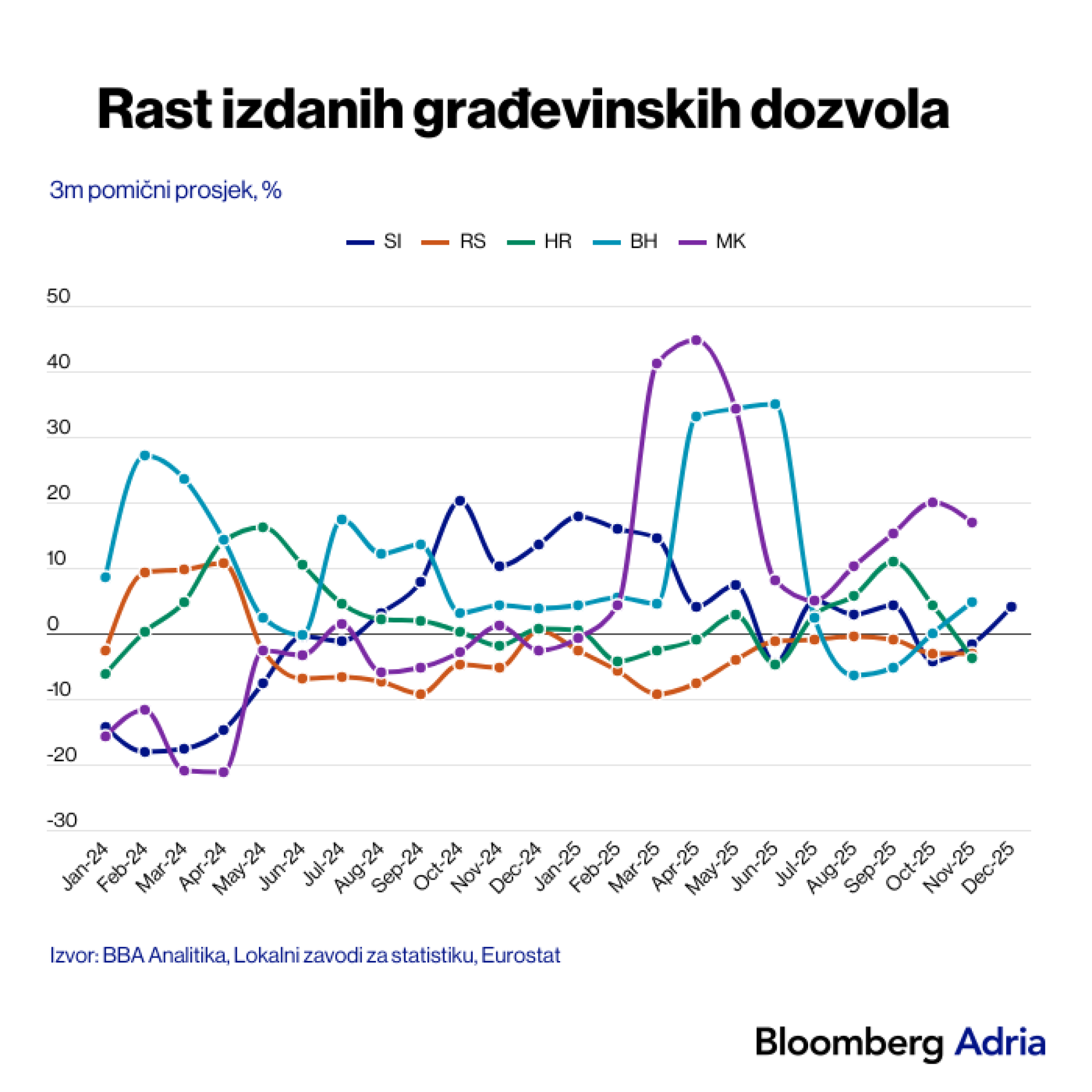 "Ove brojke potvrđuje i građevinska aktivnost koja je u pozitivnim okvirima (osim u Srbiji), dok je u BiH aktivnost usporila u trećem tromjesečju 2025. godine. S druge strane, budući rast građevinarstva može se pratiti kroz novoizdane građevinske dozvole. Najpozitivniji trendovi su u Sjevernoj Makedoniji, gdje su stope rasta dozvola visoke i dvoznamenkaste, što dodatno pridonosi povećanju ponude nekretnina, ali i snažnijoj multiplikaciji BDP-a, u jedanaest mjeseci 2025., jedino u Srbiji bilježimo pad broja dozvola", pojašnjava Blažeković.