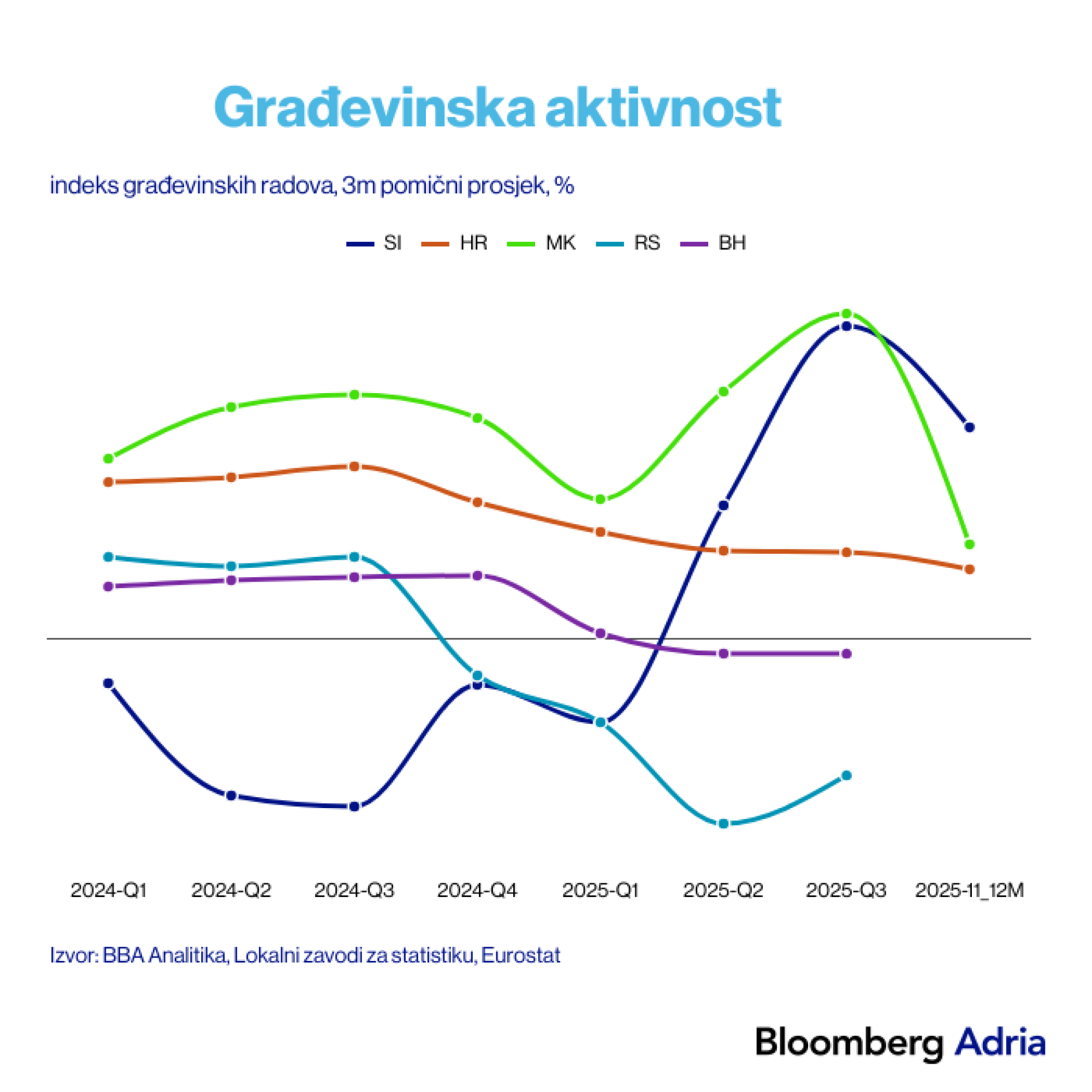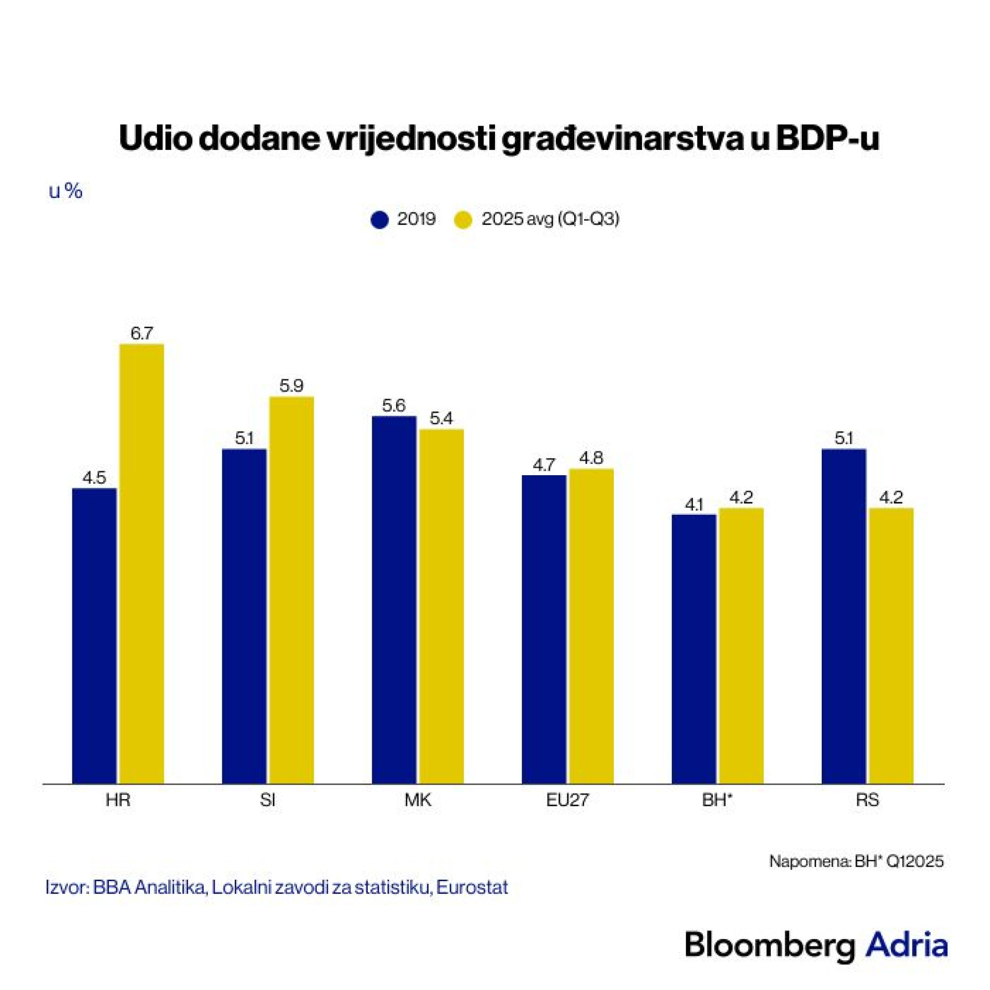 Rast u odnosu na 2019. zabilježen je u Hrvatskoj, Sloveniji i BiH, dok u Srbiji i Sjevernoj Makedoniji bilježimo pad udjela građevinarstva. Srbija je imala slabija tri tromjesečja u 2025. zbog lošijeg ekonomskog raspoloženja, dok se u Sjevernoj Makedoniji ipak vidi oporavak u drugom i trećem tromjesečju u odnosu na prvo tromjesečje prethodne godine.