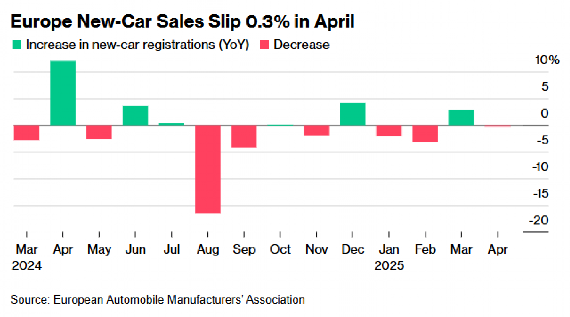 Prodaja automobila u Europi pala je u travnju zbog slabijeg gospodarskog rasta i nesigurnosti izazvane globalnim trgovinskim napetostima, što je navelo potrošače da odgode veće kupnje.