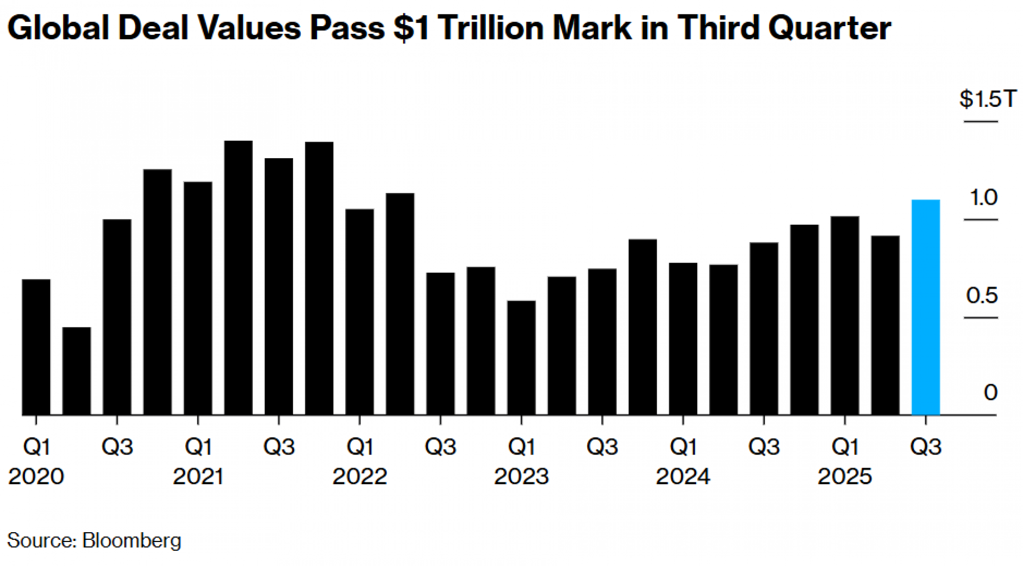Momentum M&A ubrzao je kroz tradicionalno mirnije ljetne mjesece, a vrijednosti globalnih poslova premašile su u trećem kvartalu bilijun dolara - tek drugi put otkad se ti podaci prate, pokazuju brojke Bloomberga.