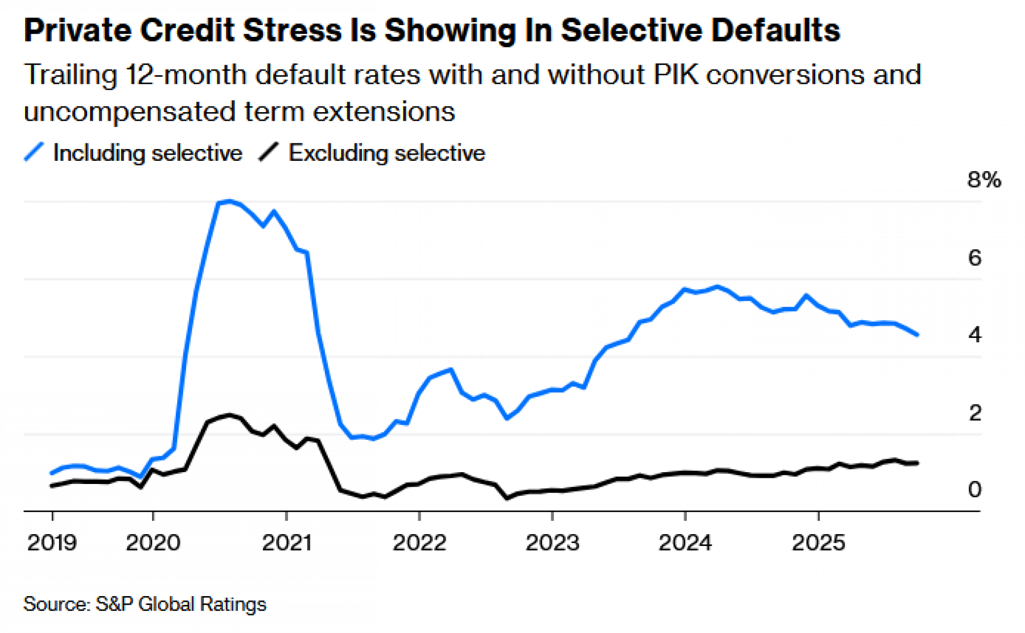 Ali to je samo dio priče. S&P također prati "selektivne neplaćanja", gdje krediti ne propadnu u potpunosti, ali zajmoprimci mijenjaju uvjete kako bi si dali prostora za disanje. U privatnom kreditiranju to uglavnom uključuje dodavanje kamata vrijednosti kredita, umjesto plaćanja gotovinom (pretvaranje duga u takozvani kredit s plaćanjem u naturi ili PIK). Ili tvrtke produžuju dospijeće bez plaćanja naknade zajmodavcima2 (lenders2).