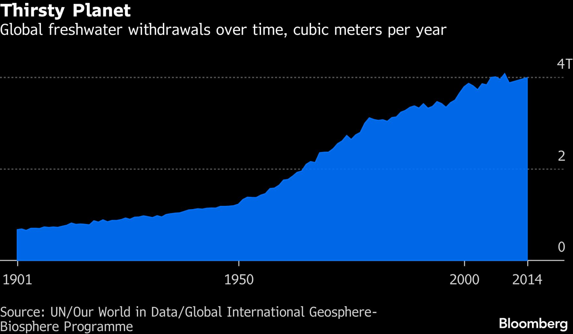 Globalno crpljenje slatke vode kroz vrijeme, u kubičnim metrima godišnje | Bloomberg