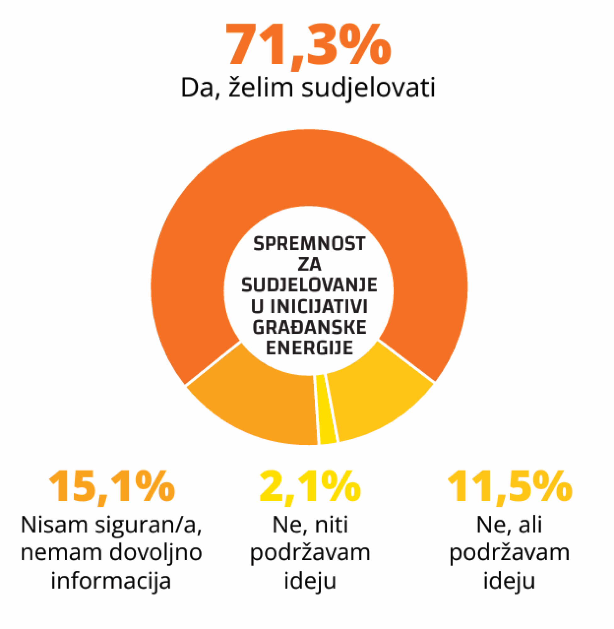 Novo istraživanje o energiji i energetskim zajednicama, provedeno u siječnju 2026. na reprezentativnom uzorku od 800 građana Hrvatske, pokazuje da 71,3 posto ispitanika želi sudjelovati u inicijativi građanske energije u kojoj bi sa susjedima proizvodili struju iz zajedničkog postrojenja na krovu ili zemljištu, pod uvjetom da je model administrativno jednostavan.