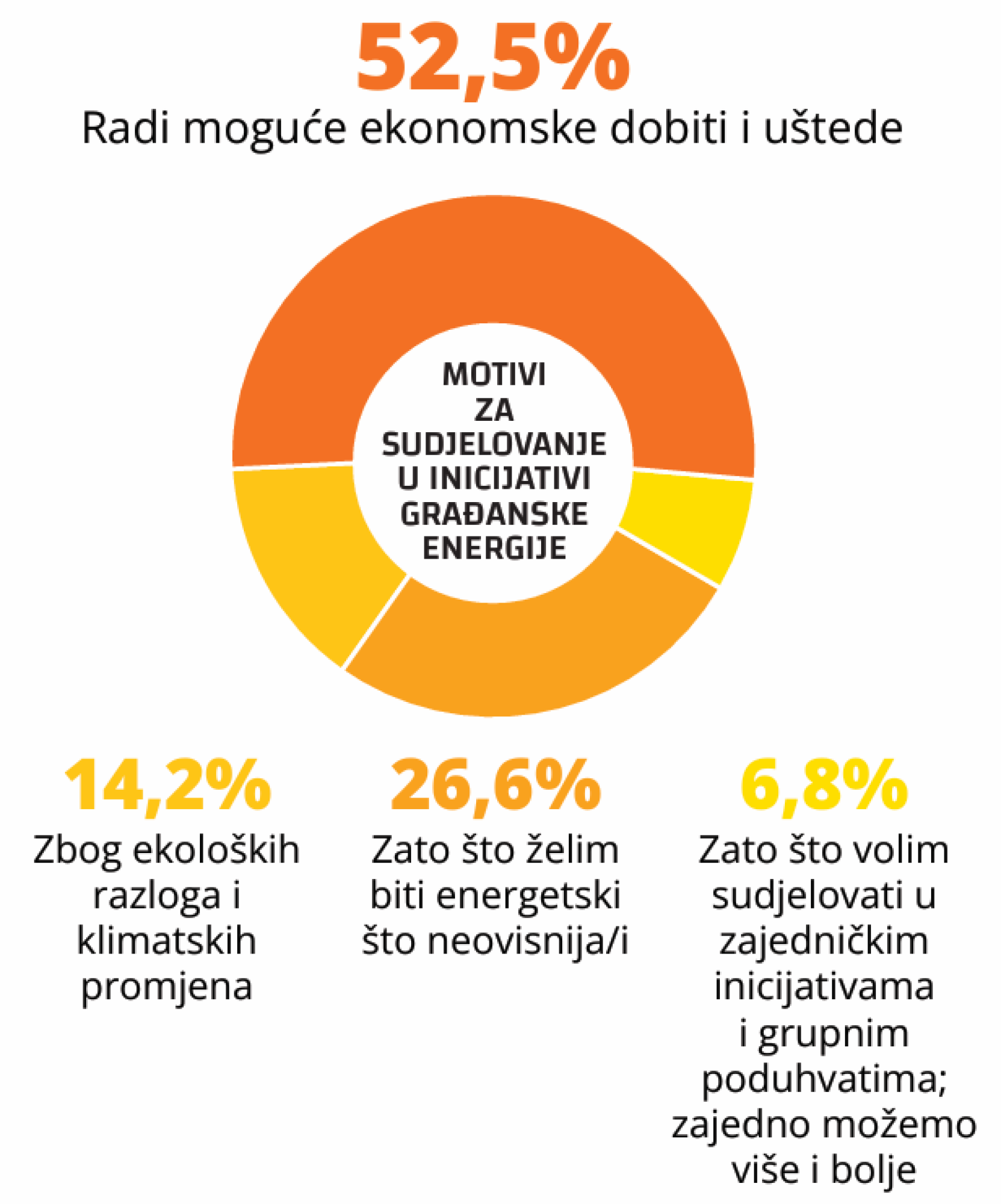 Među onima koji bi sudjelovali u energetskoj zajednici, 52,5 posto kao glavni razlog navodi moguću ekonomsku dobit i uštedu, dok 26,6 posto ističe veću energetsku neovisnost. Ekološki razlozi i klimatske promjene glavni su motiv za 14,2 posto ispitanika, a želja za sudjelovanjem u zajedničkim inicijativama za 6,8 posto.
