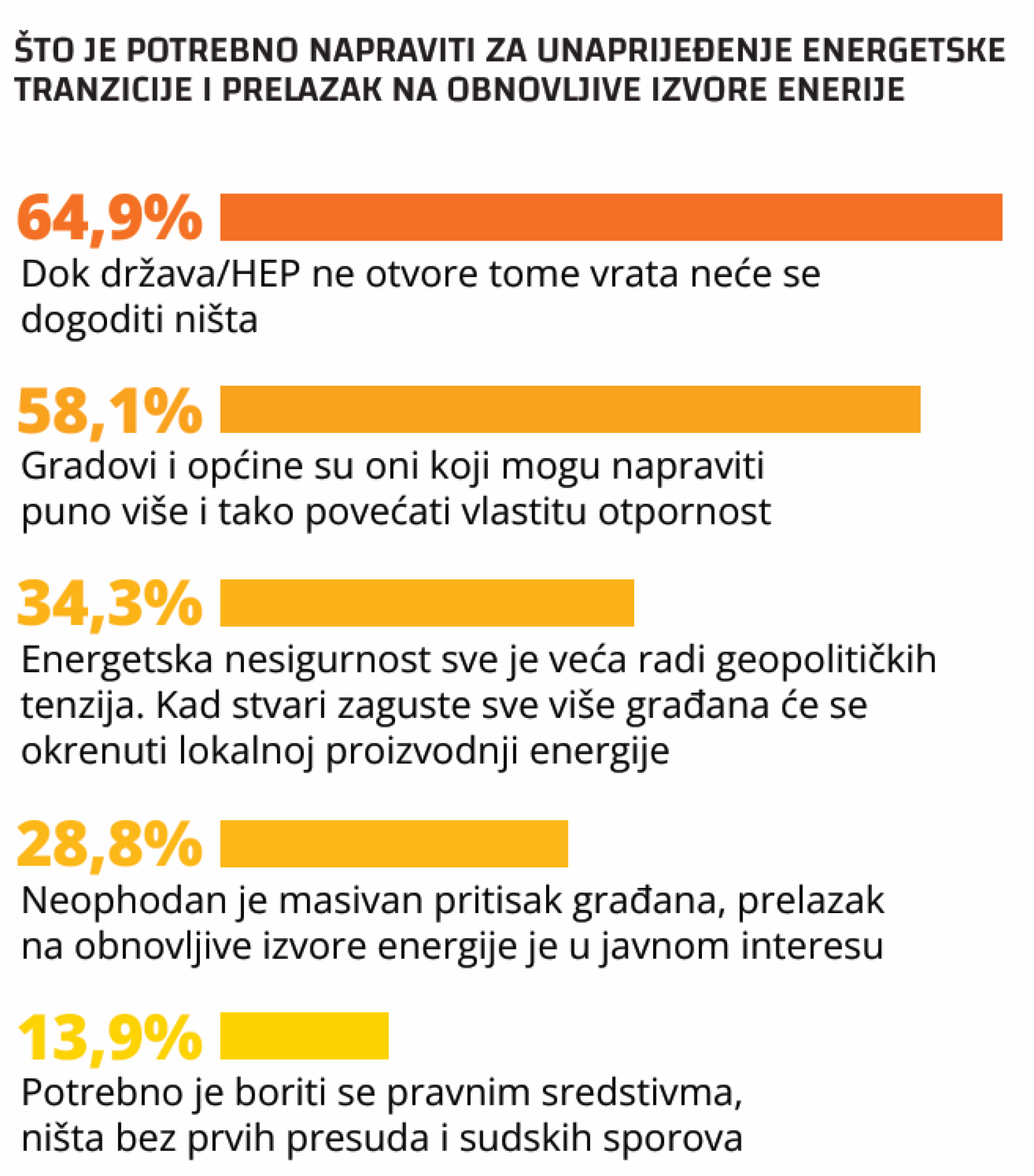 No za prelazak iz interesa u praksu bit će potrebno više od dobrih primjera. Istraživanje pokazuje da 57,2 posto građana smatra da je za rast energetskih zajednica potrebno omogućiti financijsku podršku, 48,3 posto ističe edukacije i centre podrške, 39,3 posto tehničku podršku, a 28,3 posto omogućavanje dijeljenja energije među članovima.