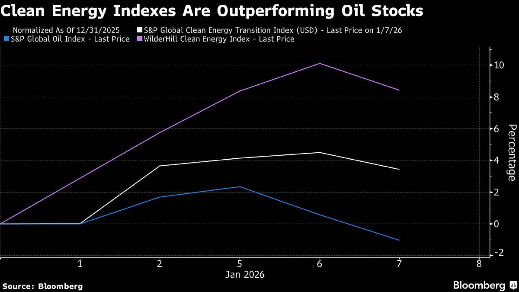 Indeks S&P Global Clean Energy Transition Index, koji prati više od pet milijardi dolara imovine u ETF-ovima, porastao je za više od tri posto u prvim danima trgovanja ove godine, dok je njegov pandan WilderShares Clean Energy Index skočio za više od osam posto. Nasuprot tome, referentni indeks proizvođača nafte i plina pao je za jedan posto.