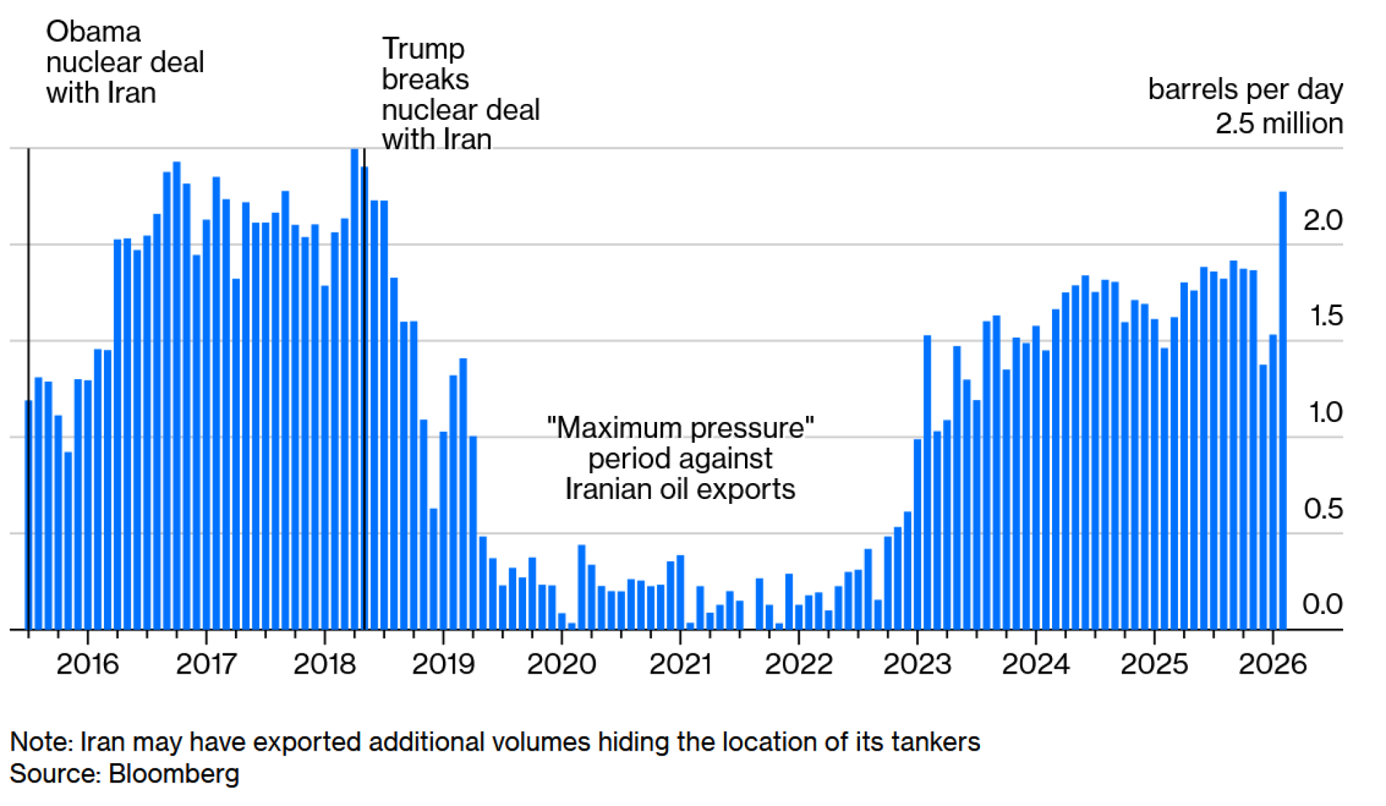 Još 2020.-2021. godine, kada je Trump pokrenuo kampanju "maksimalnog pritiska" naftnim sankcijama, iranski izvoz sirove nafte pao je na manje od 250.000 barela dnevno tijekom nekoliko mjeseci. Čak i ako se uzme u obzir da je dio izvoza prošao "ispod radara", prekomorske isporuke sirove nafte iz te zemlje nisu premašile 750.000 barela dnevno tijekom više od 24 mjeseca, između početka 2020. i sredine 2022. godine.