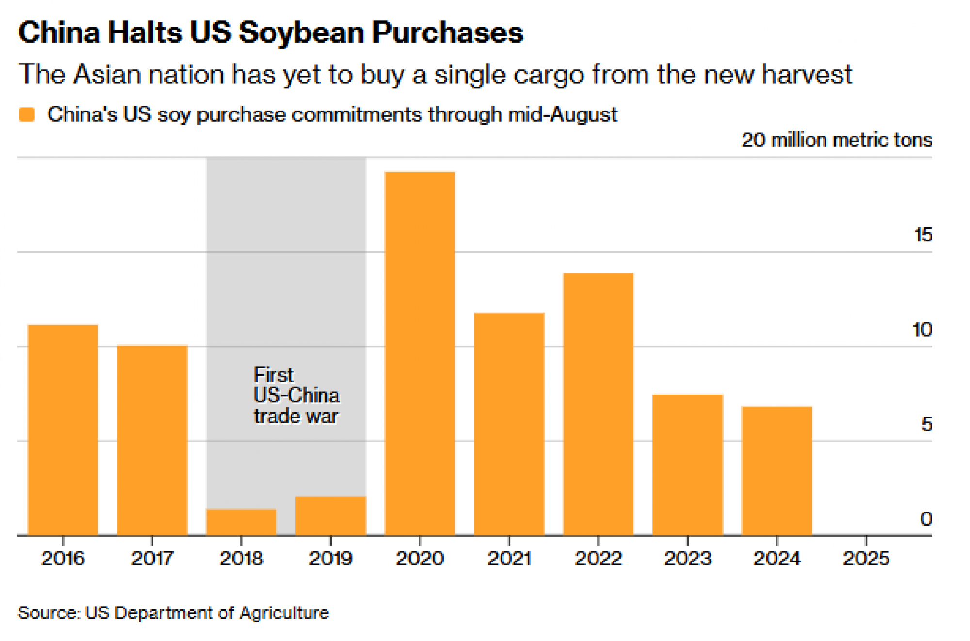 Kina je najveći svjetski kupac soje, koju uglavnom prerađuje u sojinu sačmu za prehranu svinja i sojino ulje za kuhanje. Prošle godine američki farmeri činili su otprilike petinu kineskog uvoza soje. No soja - najveći poljoprivredni izvozni proizvod SAD-a - postala je pregovarački ulog u širem trgovinskom ratu, jer Kina zadržava kupnje, taktiku koju je primjenjivala i tijekom Trumpova prvog mandata.