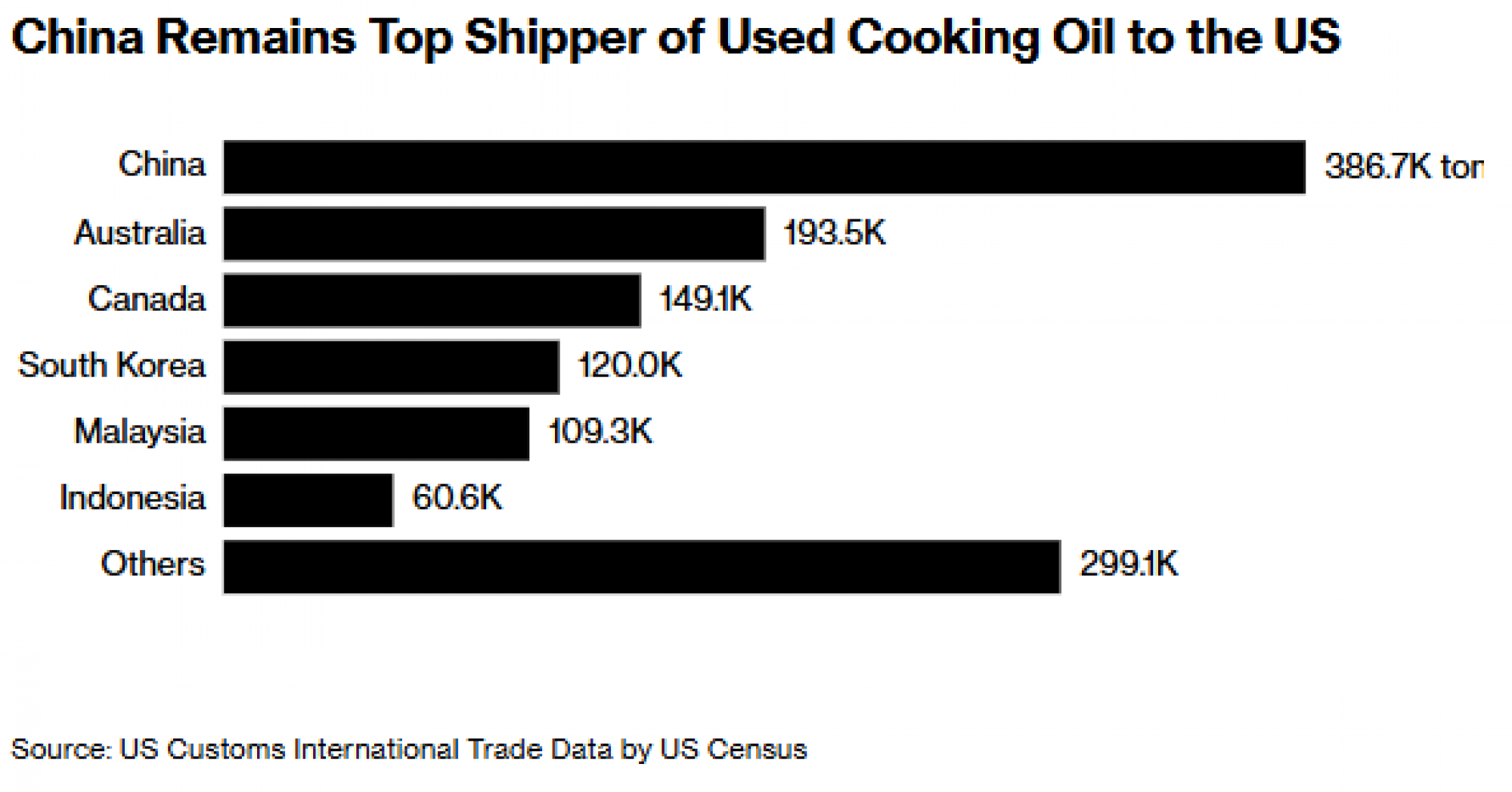 SAD je 2024. bio glavno odredište za kineski UCO, prema podacima USDA, a uvoz kineskih prerađenih jestivih ulja, uglavnom UCO-a, dosegnuo je rekordnih 1,27 milijuna metričkih tona.