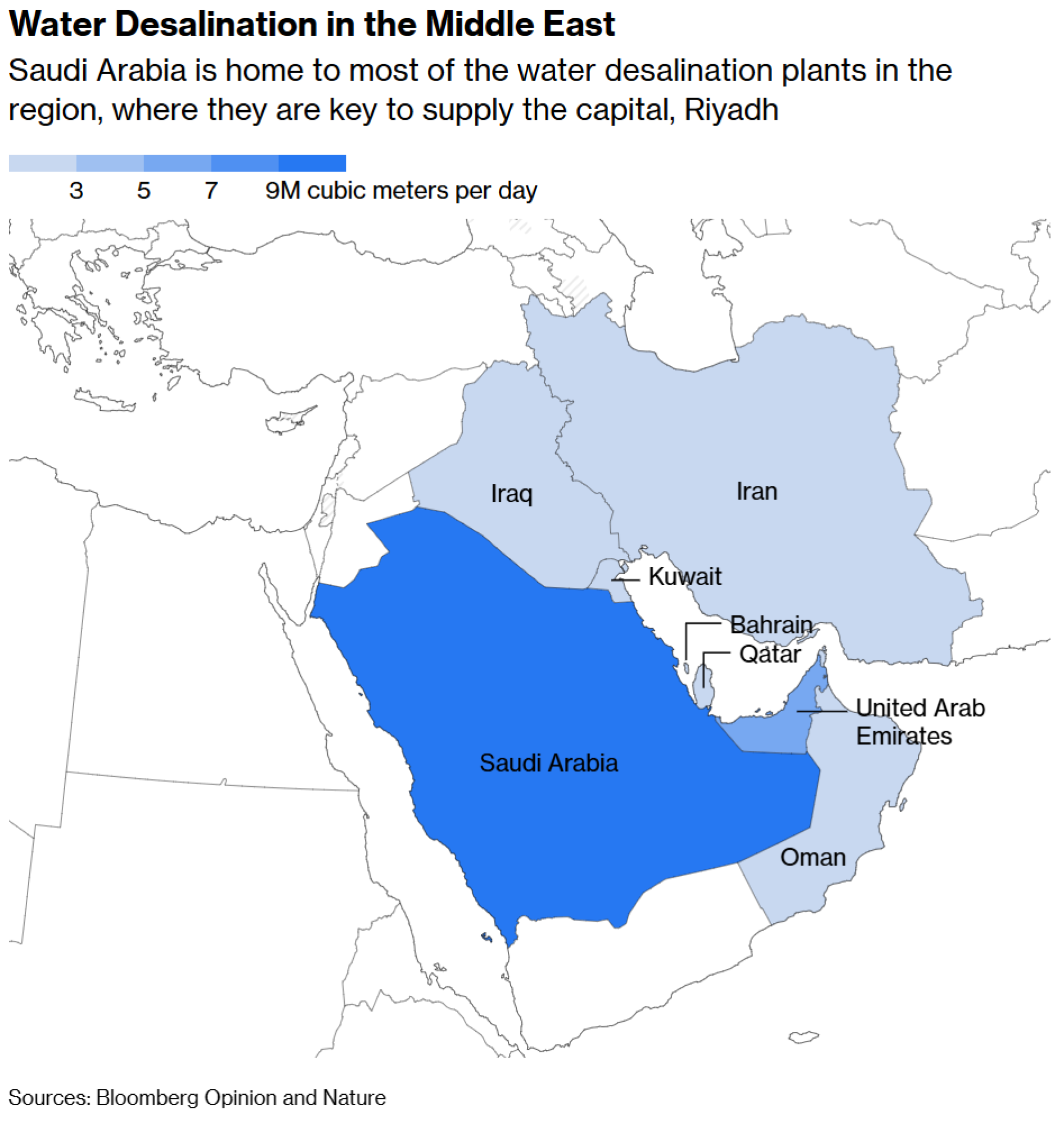 U zemljama članicama Vijeća za suradnju u Zaljevu - Saudijskoj Arabiji, Kuvajtu, Bahreinu, Kataru, UAE-u i Omanu - živi više od stotinu milijuna ljudi. Sve te zemlje trenutno su pod napadim Irana. Kuvajt, Katar i UAE u potpunosti su ovisne o postrojenjima za desalinizaciju, pogotovo metropole kao što je Dubai. Saudijska Arabija, a posebno Rijad, također je ovisna.