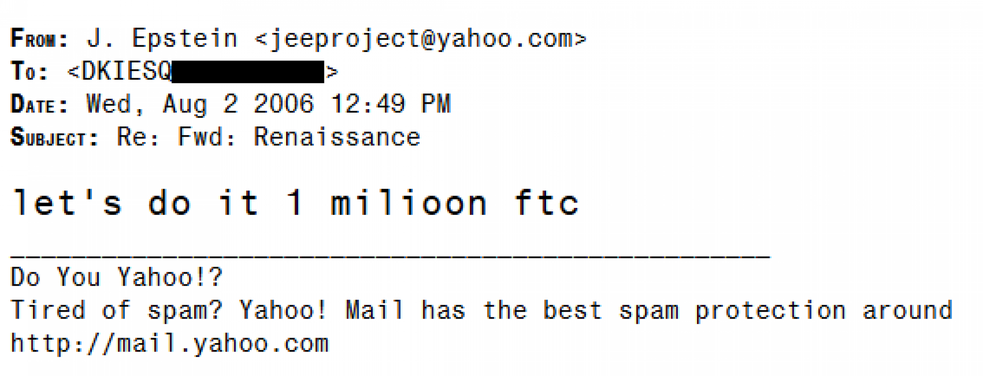 Bio je kolovoz 2006., a novine su izvještavale o optužbama da je Epstein plaćao tinejdžericama za seks. Zvijezda u usponu u Smith Barneyju, Greg Hersch, poslao je e-poruku u Epsteinov ured: "Jeffrey, želio bih te obavijestiti da će Citigroupov podfond za fond dr. Jamesa Simonsa, Renaissance, zatvoriti svoja vrata novim ulagačima krajem ovog mjeseca jer se približava svojoj gornjoj granici od 499 ulagača."
