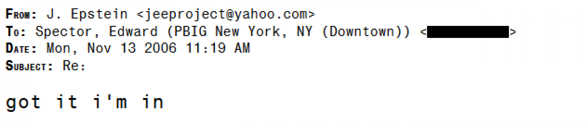 Početkom 2006. godine Epstein je zatražio uslugu koja je u Spectoru izazvala nelagodu, kako otkrivaju e-poruke financijskog savjetnika: "Jeffrey, upravo sam se vratio u ured u New Yorku. Molim te, shvati da sam razmišljao o našem razgovoru posljednjih nekoliko dana i dvije su mi stvari pale na pamet... prvo, ne poznajem ovog gospodina (bez imena) dovoljno dobro da bih mu to spomenuo. Gledao bi me kao da sam lud i pitao koji su moji interesi. Poznajem ga samo s poslovne strane. Također, čak i ako se zahtjev čini nevinim, mogao bi mi uzrokovati mnogo internih problema ako ovaj gospodin smatra da je razgovor neprimjeren. U organizaciji za to postoji nulta tolerancija.“