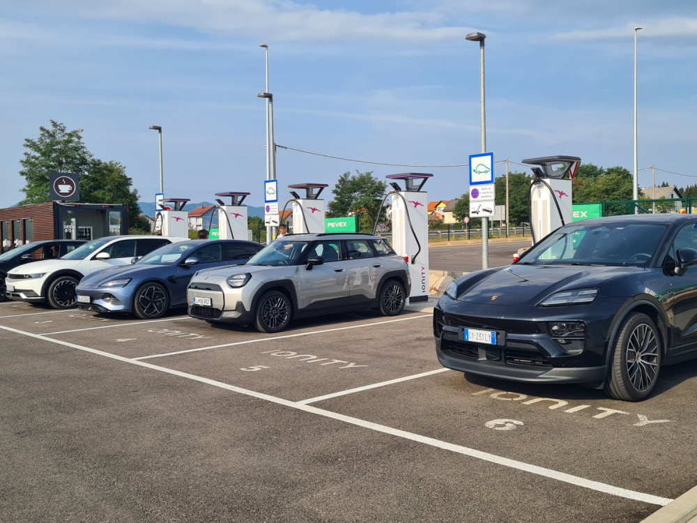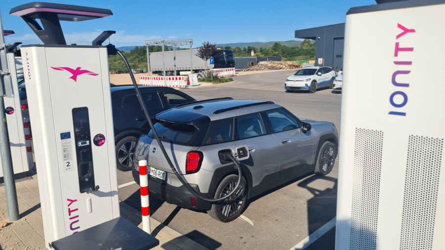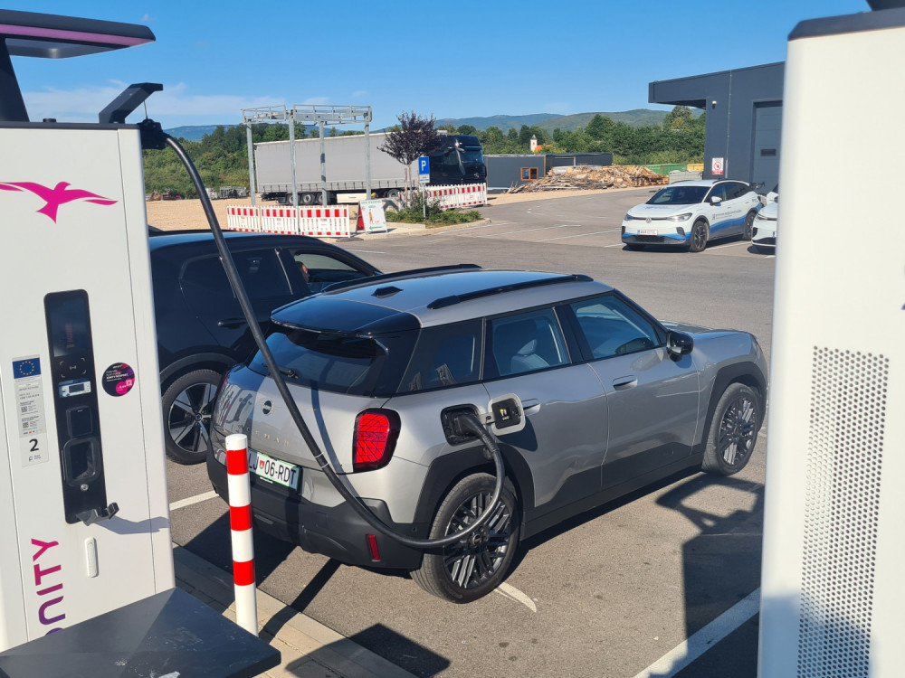 Svih šest mjesta na Ionity punionici kod Gospića bilo je zauzeto. Jedno je odmah bilo slobodno, ali to je bilo zato što punionica nije bila u funkciji. Srećom, automobili su se brzo mijenjali. Bio sam drugi u redu. Čekao sam pet minuta na svoj red. Mini se punio brzinom do 70 kilovata. Nakon 45 minuta napunio sam 31 kWh. Većina putovanja je već bila iza mene, pa sam bez puno brige nastavio putovanje s 247 kilometara dometa.