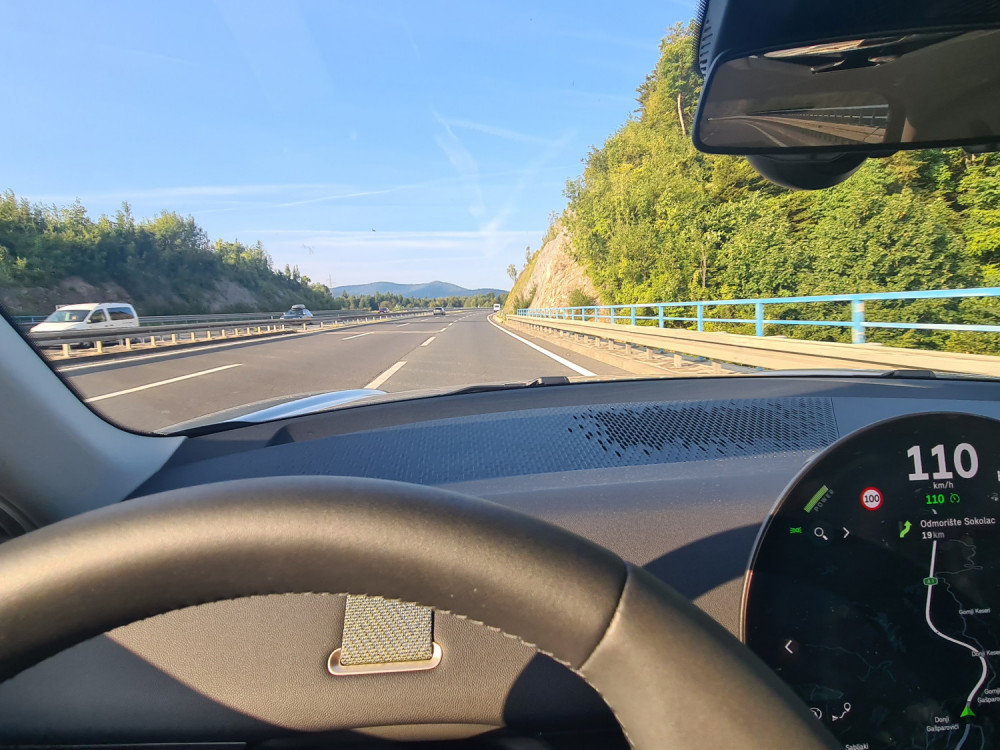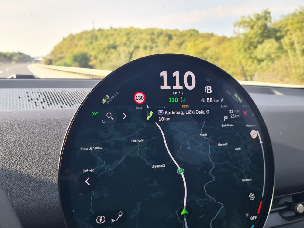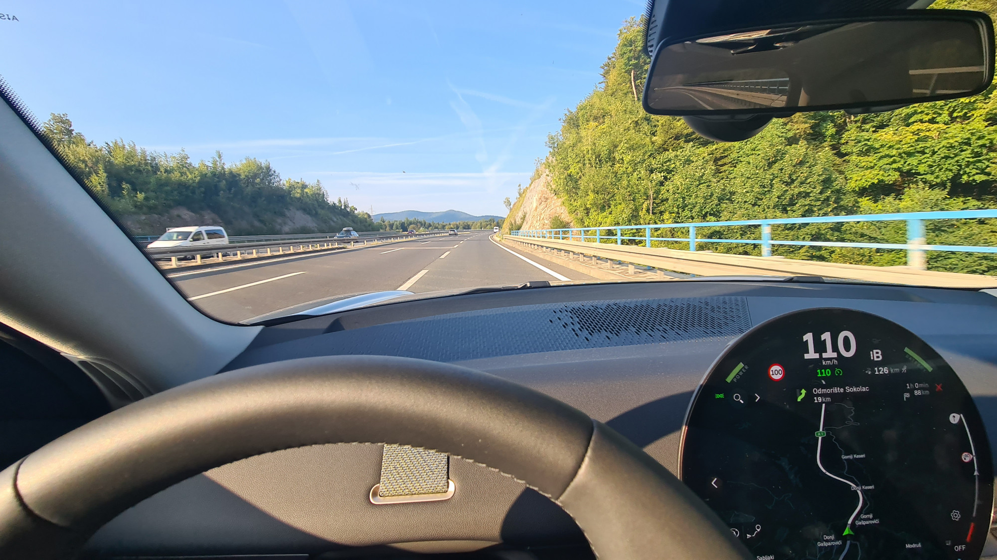 Na put sam krenuo opušteno. Odabrao sam rutu pored Zagreba. Prva stanica mi je bila Čatež na Savi, gdje sam auto napunio za 50 minuta. Tu je počeo teži dio putovanja. Kako će se domet smanjiti na autocesti? Brzo sam napredovao do Karlovca, ali se domet predvidljivo smanjio. Zatim sam u navigaciju upisao punionicu kod Gospića. Računalo je smanjilo prikazani domet za oko 60 kilometara i odmah mi se malo zavrtjelo u glavi. Domet je pao na 170 kilometara, a do punionice je još uvijek bilo više od 150.