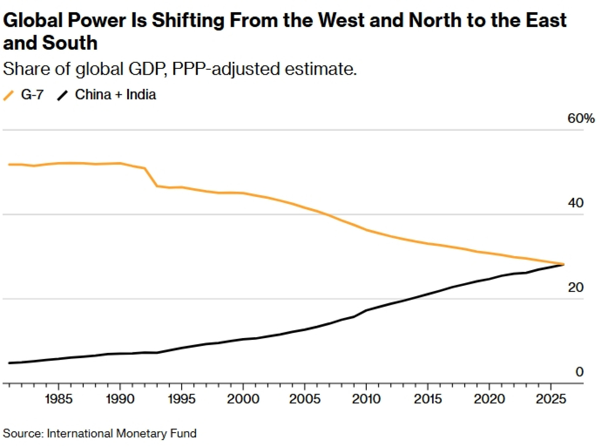 Razumijevanje ovog novog poretka ovisi o razumijevanju triju temeljnih trendova. Prvi je tekuća preraspodjela globalne moći među nacijama. Nakon pet stoljeća koncentracije na Zapadu i Sjeveru, moć se raspršuje prema Istoku i Jugu. Od 1990. do 2025. godine, udio svjetskog bruto domaćeg proizvoda u rukama skupine G7 (Francuska, Njemačka, Italija, Kanada, Japan, UK i SAD) smanjio se s polovice na četvrtinu, dok je udio Kine, Indije i jugoistočne Azije porastao s 15 posto na 55 posto.