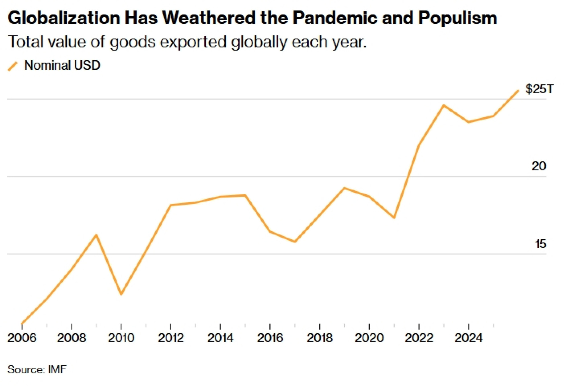 Treći temeljni trend koji oblikuje svijet je sve veća globalna povezanost. I to je u suprotnosti s općim dojmom. Iako se često proglašava mrtvom, čini se da je globalizacija preživjela populizam i pandemiju. Čak i uz efektivnu američku carinsku stopu koja je skočila s 2,2 posto na otprilike 10 posto, predviđa se da će svjetska trgovina rasti istim tempom kao i proteklog desetljeća. Izravna strana ulaganja porasla su za 14 posto u 2025. godini. Političari zagovaraju nacionalnu samodostatnost, vraćanje opskrbnih lanaca u zemlju i oživljavanje domaće industrije, no podaci ne pokazuju nikakav značajan pomak s međunarodne na domaću aktivnost.
