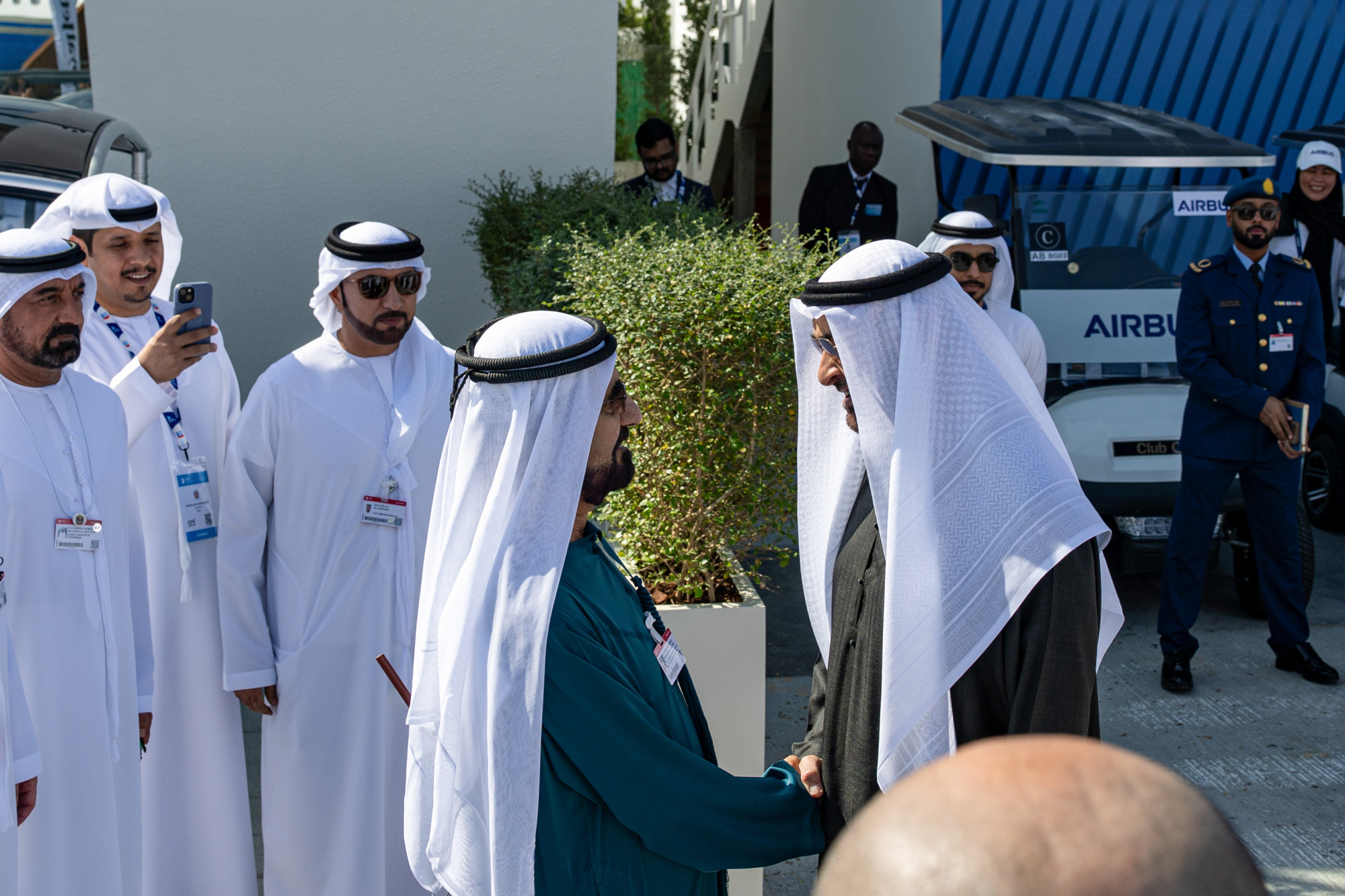 Šeik Mohammed bin Zayed Al Nahyan, predsjednik Ujedinjenih Arapskih Emirata, desno, rukuje se sa šeikom Mohammedom bin Rashidom Al Maktoumom, vladarom Dubaija, na Dubai Airshowu u studenom | Christopher Pike/Bloomberg