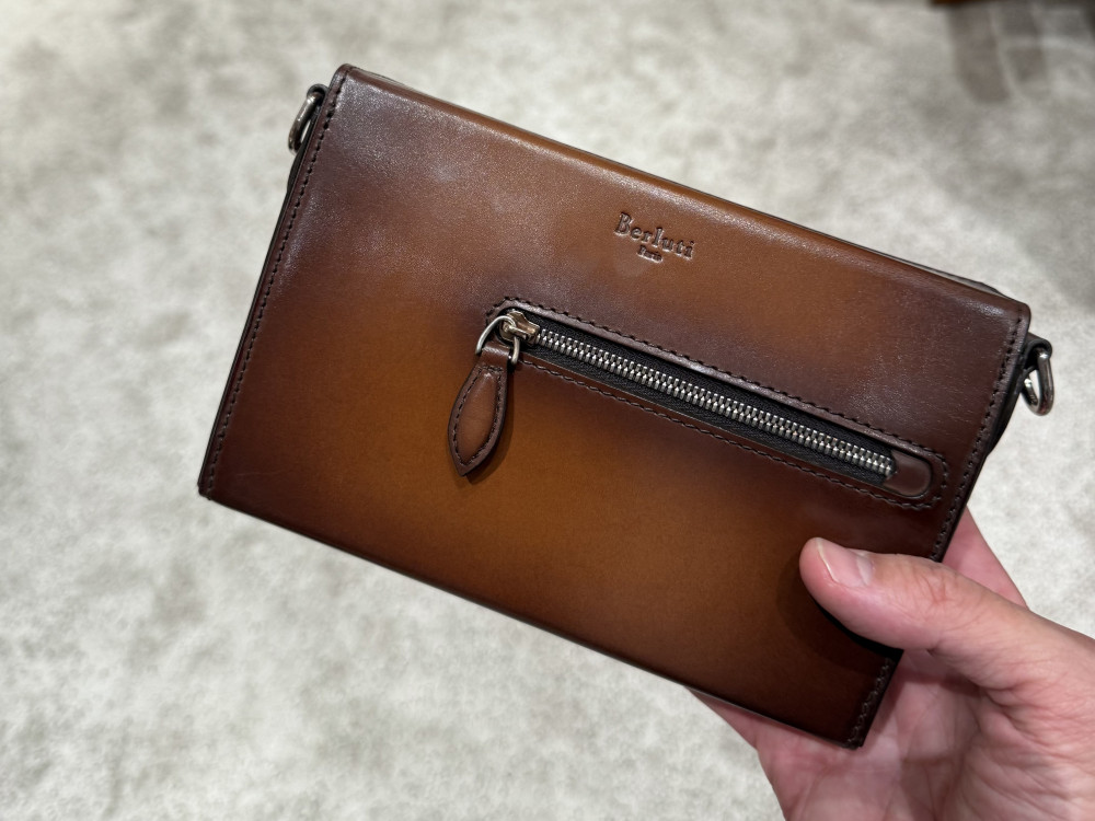 Mnogi Berlutijevi kožni proizvodi, svi proizvedeni u Italiji, nose prepoznatljivu patinu brenda, uključujući i simpatičnu torbicu Jour de Pouch, dimenzija i oblika da u nju stane točno jedna knjiga, koju sam vidio tijekom intervjua. Berlutijeva jakna Forestière, izvorno dizajnirana za arhitekta Le Corbusiera i izrađena u francuskoj kući Arnys (koju je Berluti preuzeo 2012.), nudi se u nekoliko novih varijanti za sljedeću sezonu. Pod Mansveltom, brend se fokusira na te osnovne motive, a ne na širok raspon novih dizajna.