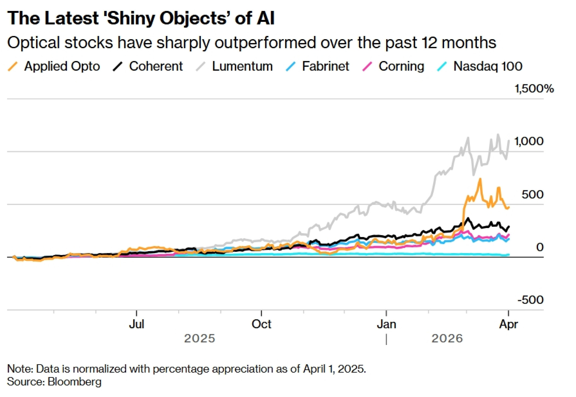 Lumentum je skočio više od 1100 posto tijekom posljednjih 12 mjeseci, što je drugi najbolji rezultat u indeksu S&P 500. Applied Opto porastao je preko 470 posto, uključujući dobitak od više od 90 posto samo u veljači. Coherent je skočio 270 posto, što ga čini devetim najboljim izvođačem u S&P 500 u protekloj godini.