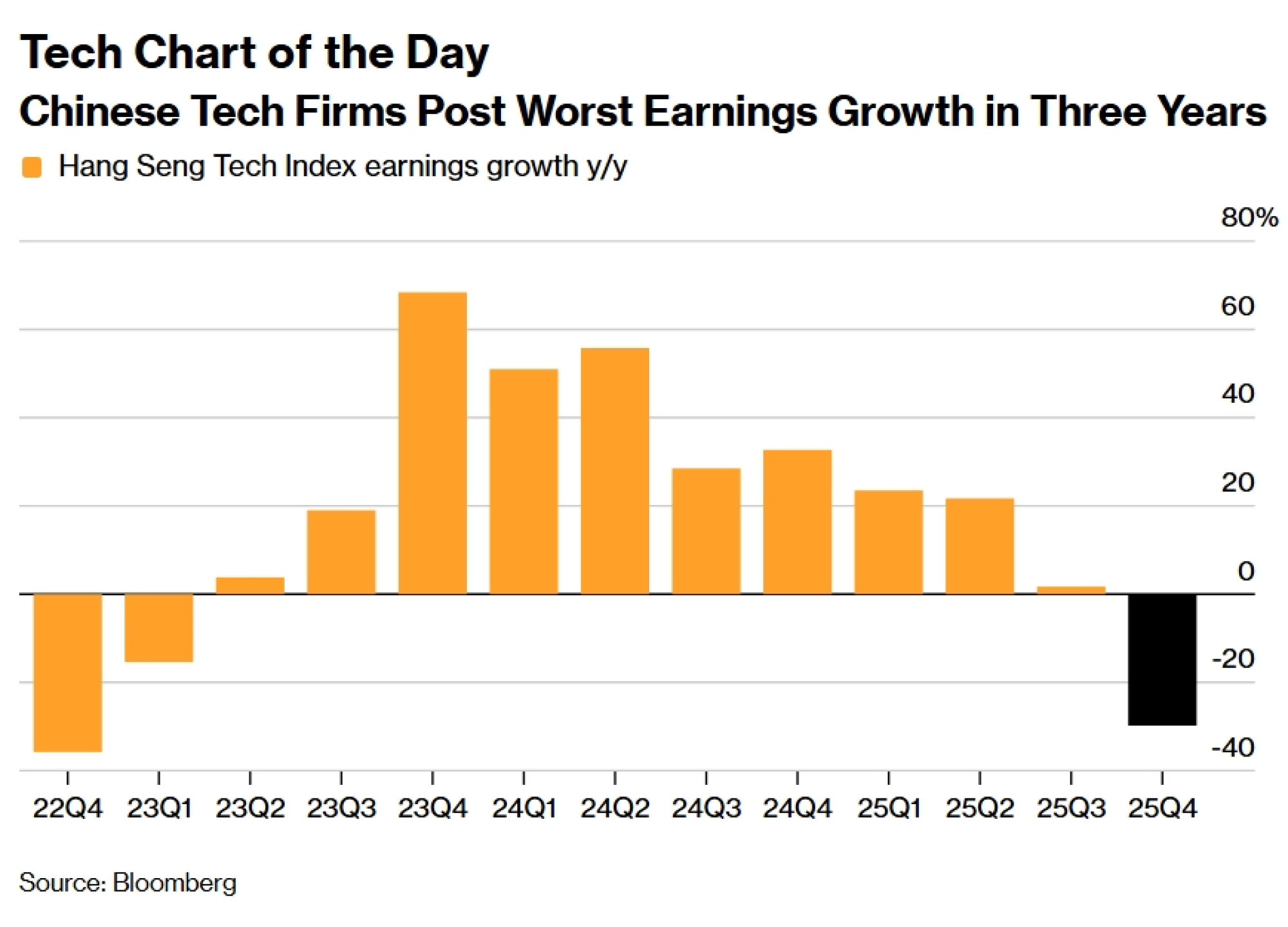 Kineske tehnološke tvrtke izvijestile su o svom najslabijem kvartalnom rastu dobiti u tri godine, ostavljajući dodatnu sumnju investitorima koji traže oporavak dionica u tom sektoru. Dobit 30 članica indeksa Hang Seng Tech pala je za 30 posto u tri mjeseca do prosinca u usporedbi s godinom ranije. To je najlošiji učinak od 2022. godine, kada su dobit narušile regulacije u tehnološkom sektoru i slab oporavak potrošnje nakon Covida.