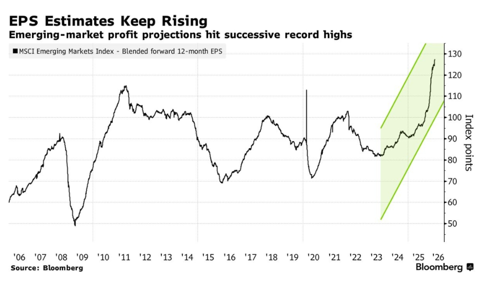 Zasad su dionice tržišta u razvoju i dalje oko tri posto ispod predratnih razina. Ipak, stratezi iz Citigroup Inc.-a i Goldman Sachs Group Inc.-a su među onima koji smatraju da nadogradnje procjena zarade pripremaju tržište za snažan oporavak u nadolazećim mjesecima. Porast procjena buduće dobiti po dionici (EPS) ponovno čini dionički rizik privlačnim, prema Citiju, koji je prošlog tjedna dodao južnokorejske dionice u svoj portfelj.