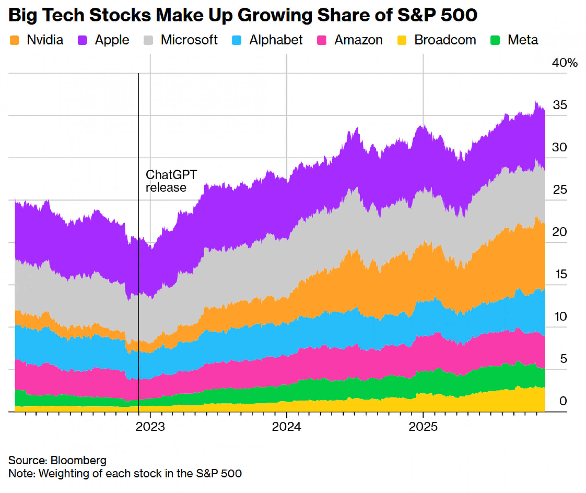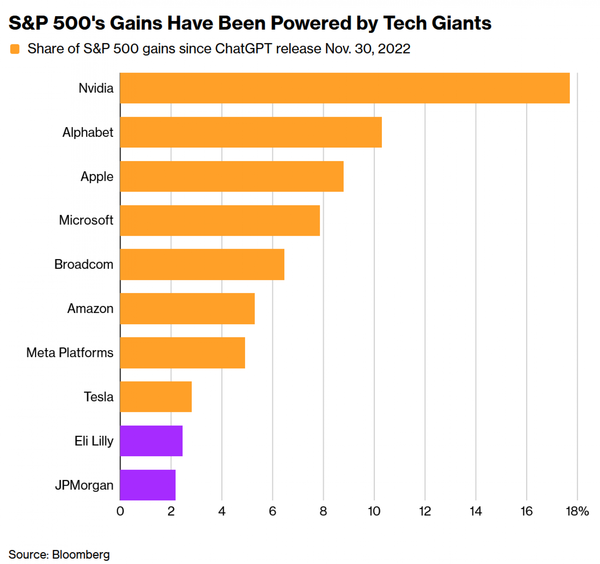 Rast potaknut entuzijazmom za umjetnu inteligenciju bio je glavna pokretačka snaga skoka S&P 500 od 64 posto od izlaska chatbota. Sedam najvrjednijih tvrtki u S&P 500 - Nvidia Corp., Microsoft Corp., Apple Inc., Alphabet Inc., Amazon.com Inc., Meta Platforms Inc. i Broadcom Inc. - svi su glavni igrači u tehnologiji i čine gotovo polovicu dobitaka benchmarka tijekom tog vremena, prema podacima koje je prikupio Bloomberg.