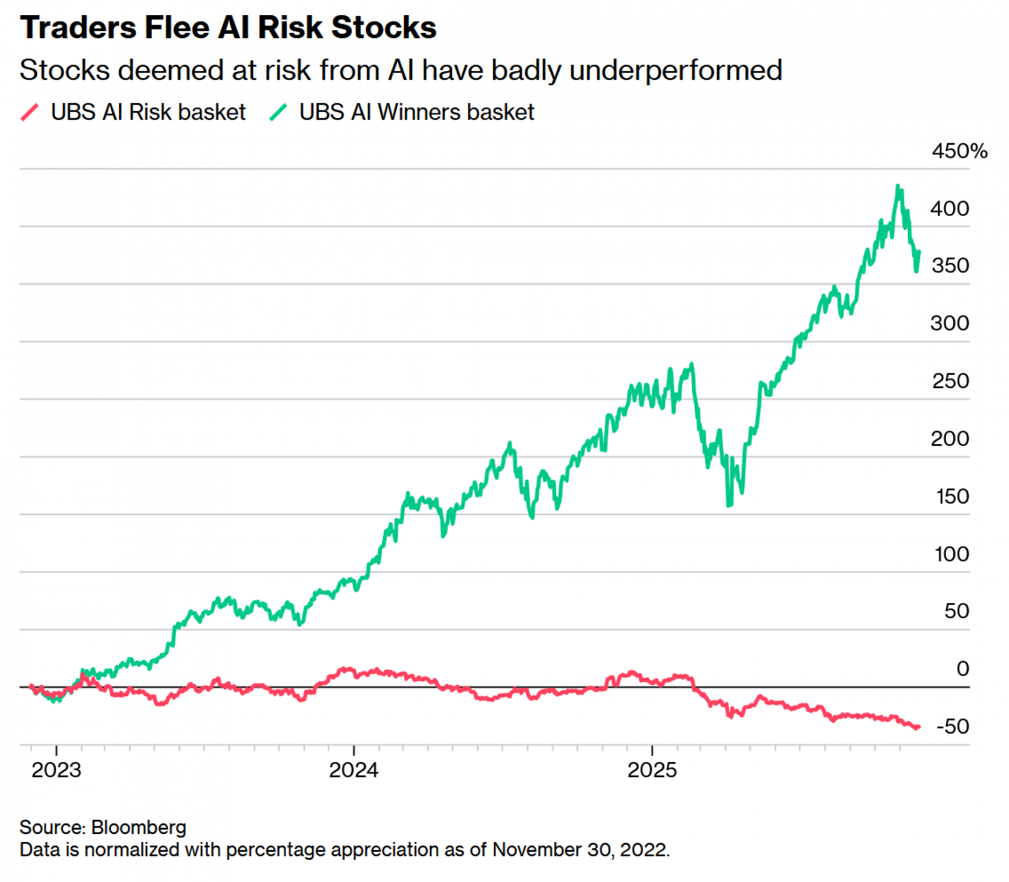 Strahovi od poremećaja izazvali su bijeg tvrtki za koje se smatra da su posebno izložene riziku od umjetne inteligencije. To uključuje proizvođače softvera, tvrtke za zapošljavanje, pa čak i reklamne agencije. Košarica takvih dionica koju je sastavio UBS pala je za više od trećine od objavljivanja ChatGPT-a, dok se tehnološki naglašeni indeks Nasdaq 100 udvostručio.