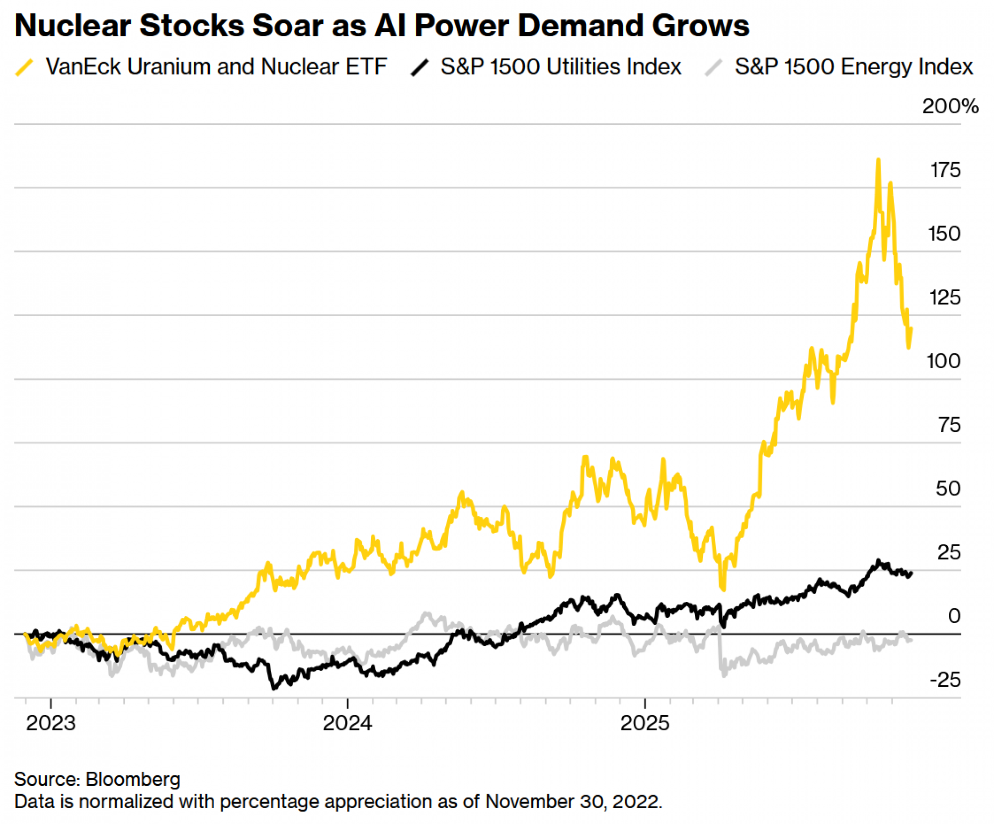 Dok dominantna pozicija velikih tehnoloških tvrtki u utrci za izgradnju AI računalne infrastrukture možda nije iznenađenje, prateći rast dobavljača električne energije bio je pomalo šokantan. Dionica Vistra Corp. porasla je za 620 posto u posljednje tri godine, što je čini četvrtim najboljim izvođačem u S&P 500. NRG Energy Inc. i Constellation Energy Corp. dobili su više od 250 posto u tom razdoblju.
