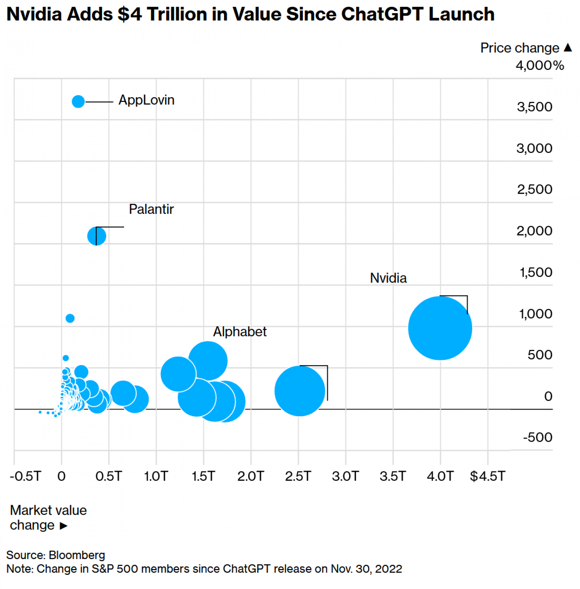 Nijedna tvrtka nije više profitirala od eksplozije ulaganja u umjetnu inteligenciju od proizvođača čipova Nvidie. S obzirom na to da se stotine milijardi dolara godišnje troše na računalnu opremu, njezine grafičke procesorske jedinice, koje dominiraju tržištem umjetne inteligencije, doživljavaju naizgled nezasitnu potražnju. Dionica je porasla za 979 posto od predstavljanja ChatGPT-a, što je treći najbolji učinak u S&P 500 tijekom tog vremena.