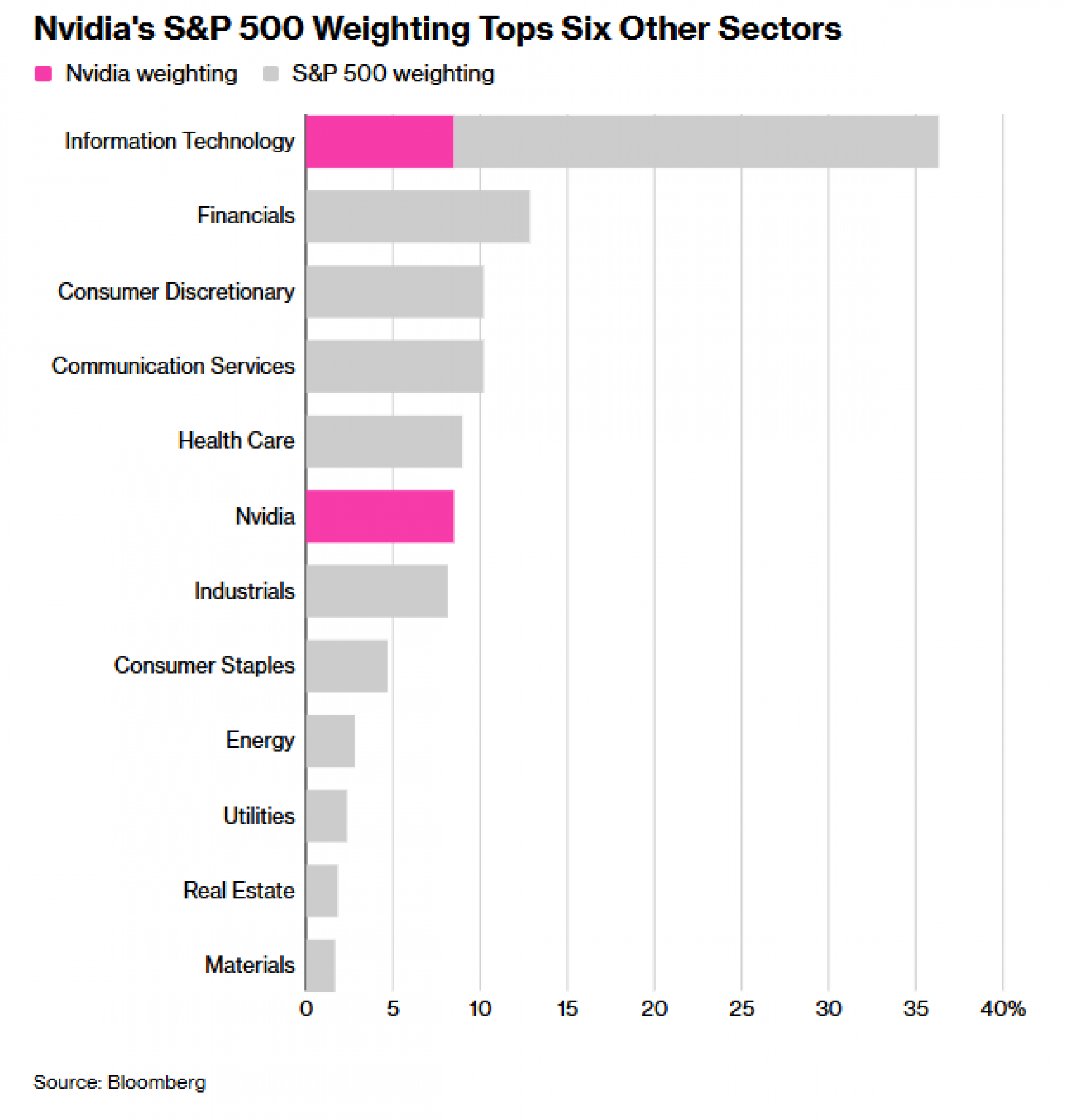 Kao najveća tvrtka na svijetu, Nvidia prirodno ima i najveći udio u glavnim burzovnim indeksima koji se temelje na tržišnoj kapitalizaciji. Dionica čini 8,5 posto indeksa S&P 500 - više nego 240 najmanjih tvrtki zajedno.
