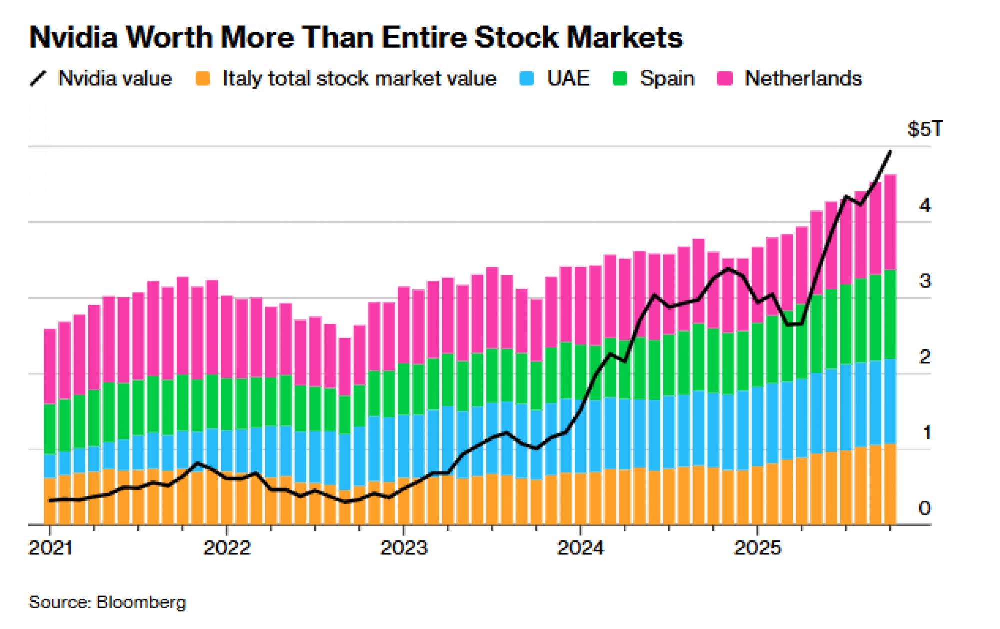 Nvidia Corp. prošlog je tjedna ušla u povijest kada je postala prva tvrtka ikada koja je dosegnula tržišnu vrijednost od pet bilijuna dolara. No to je samo jedan od načina na koji baca sjenu na globalno gospodarstvo.