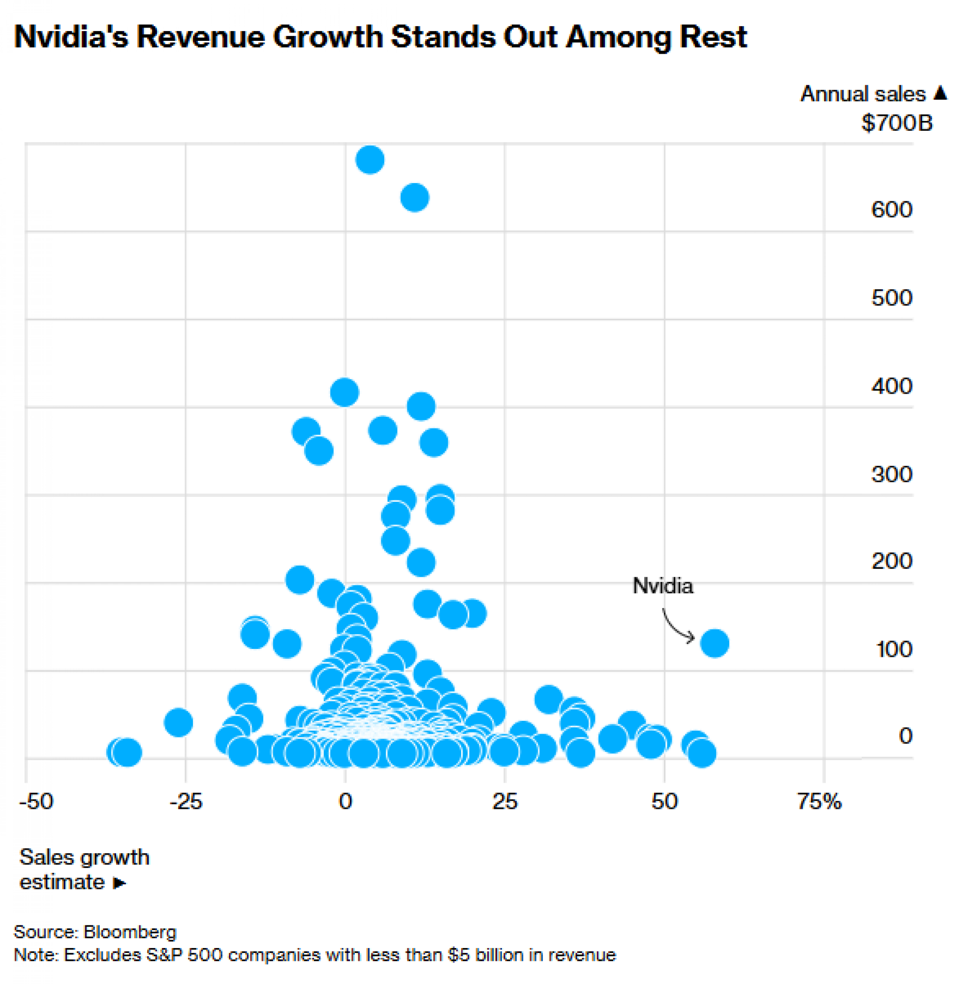 Kako tvrtke rastu, stopa rasta prodaje obično usporava jer se uspoređuje s većom osnovom. Prosječan godišnji rast prihoda za tvrtke u S&P 500 s više od 100 milijardi dolara predviđene prodaje iznosi šest posto. Nvidia je i ovdje iznimka - očekuje se da će njezini prihodi porasti za gotovo 60 posto u tekućoj fiskalnoj godini.