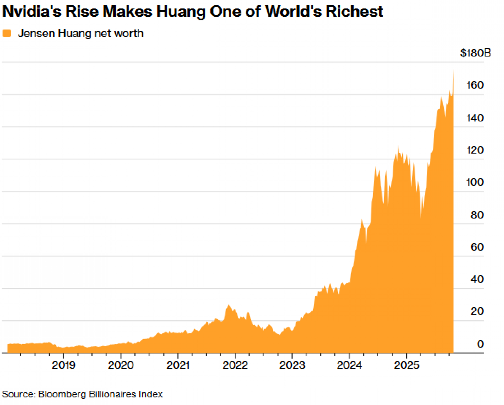 Huangovo bogatstvo eksplodiralo je zajedno s rastom vrijednosti dionice Nvidije, dosegnuvši 176 milijardi dolara prema Bloomberg Billionaires Indexu. To je više od 60 milijardi više samo ove godine - dovoljno da uđe među deset najbogatijih ljudi na svijetu. Huang posjeduje oko 3,5 posto tvrtke, osobno i kroz obiteljske trustove, prema prijavi podnesenoj američkoj Komisiji za vrijednosne papire (SEC) u listopadu.