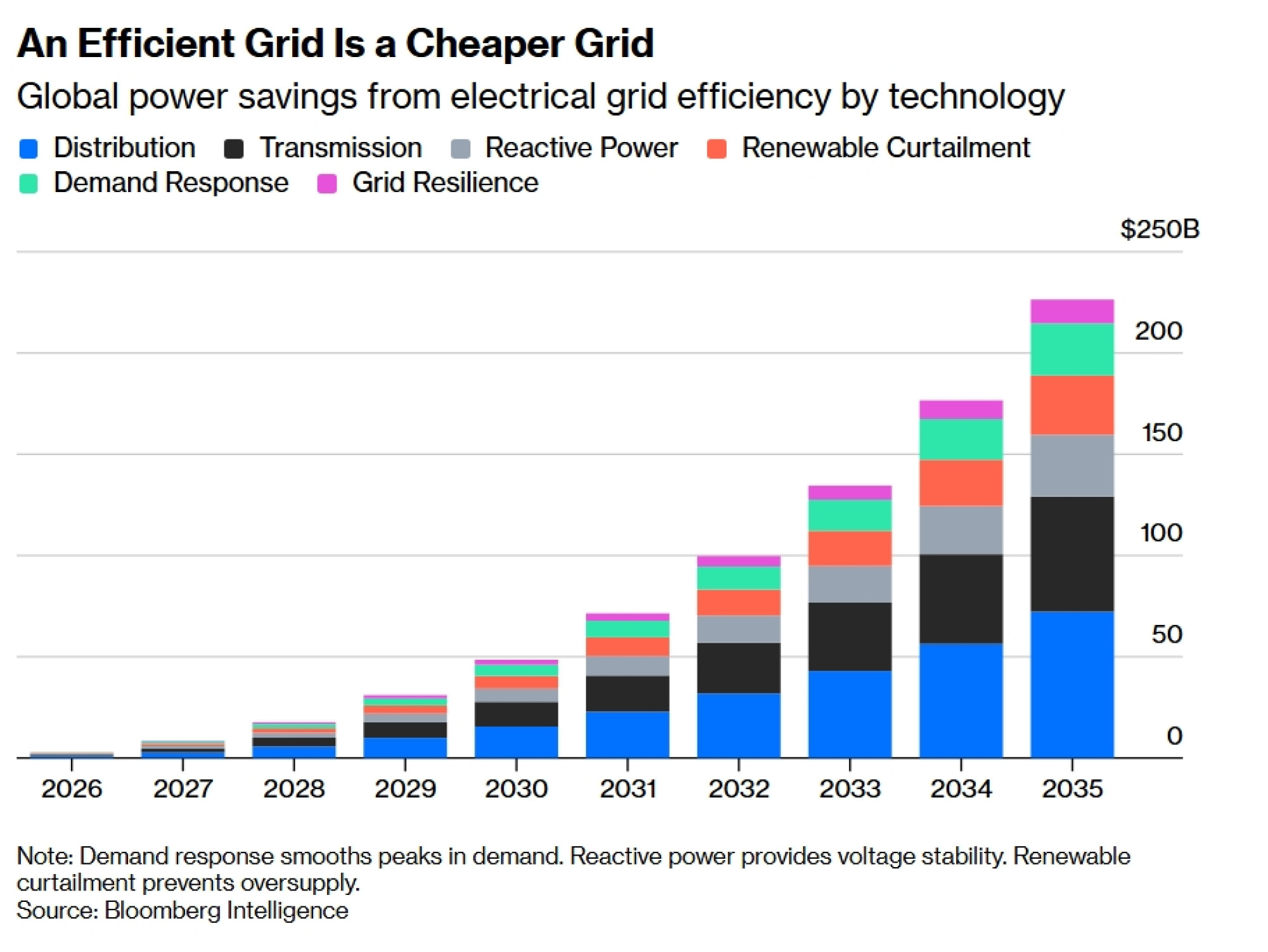 Jer to je zapravo prilično uzbudljivo, relativno govoreći. Samo krpanjem rupa u našim starim mrežama, kroz koje oko osam posto globalne proizvodnje električne energije pobjegne u nepovrat, mogli bismo uštedjeti gotovo 230 milijardi dolara u troškovima energije tijekom sljedećeg desetljeća, procjenjuje analitičar Bloomberg Intelligencea Andrew John Stevenson u novom izvješću.