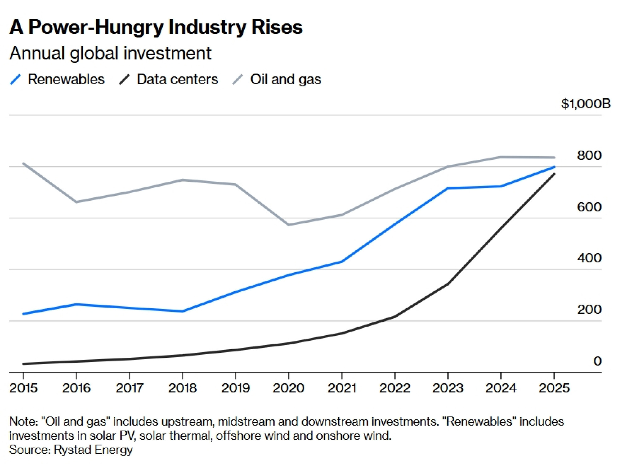 Neće biti ni trenutak prerano: globalna ulaganja u podatkovne centre skočila su na 771 milijardu dolara prošle godine, gotovo dostigavši ulaganja u naftu i plin (835 milijardi dolara) i najčešće obnovljive izvore energije (798 milijardi dolara), prema novom izvješću konzultantske tvrtke Rystad Energy.